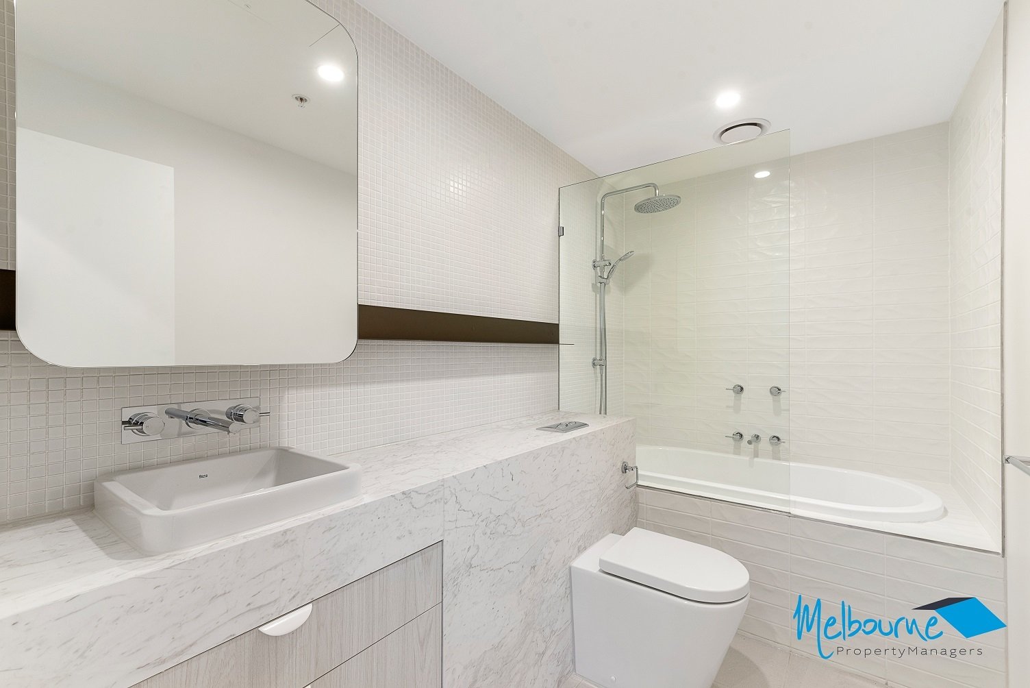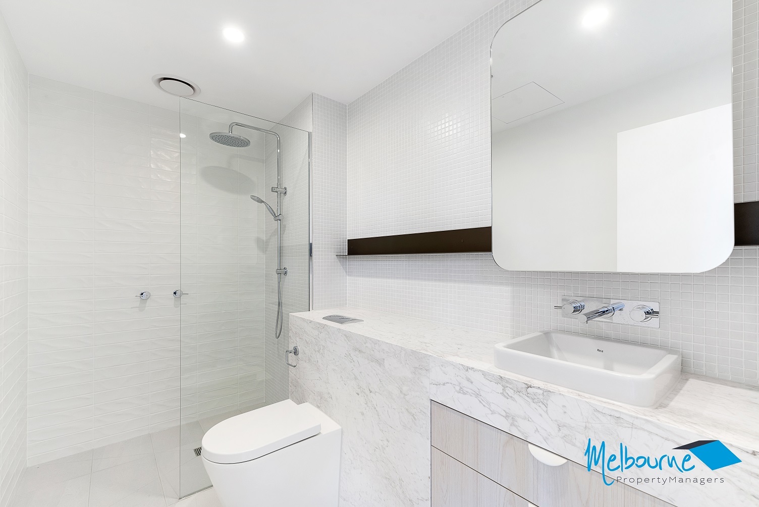 The elegant bathrooms are designed with skilful detailing, from the contrasting feature tiling to the shapely curves of the mirrors and basins at the marble vanity. Featuring rain head showers, stainless steel fixtures, ample shelving and storage space, the bathroom in this stunning apartment offers chic, luxurious efficiency.