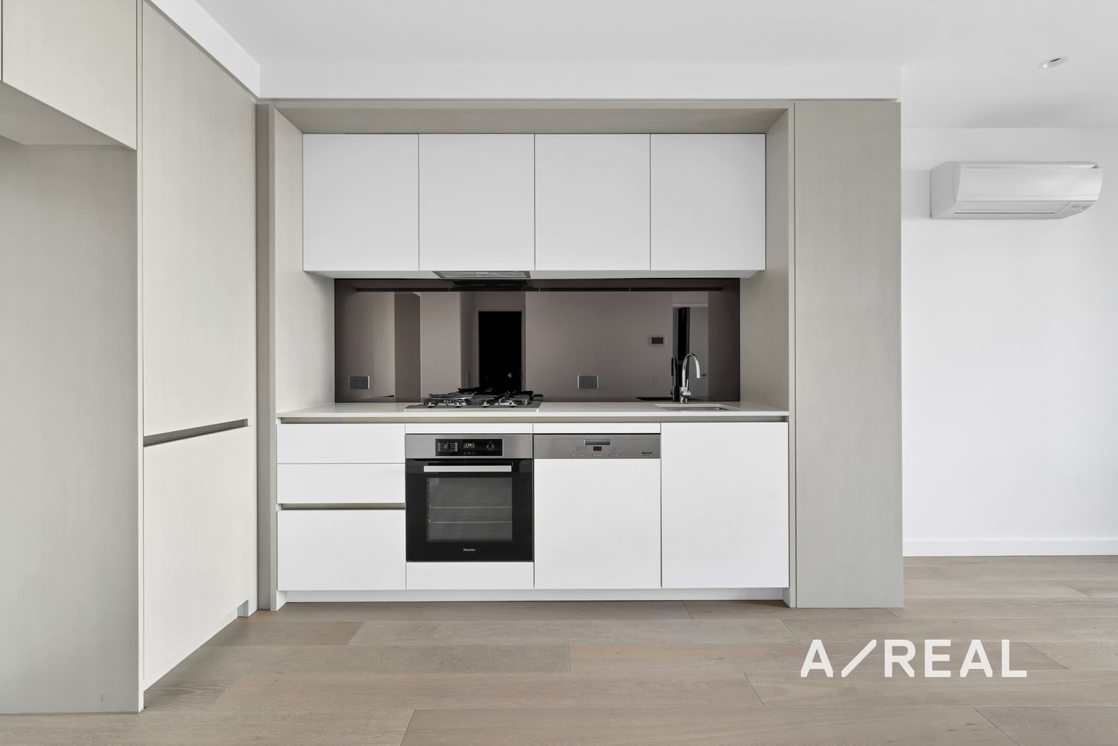 Designed with a focus on space and natural light, the apartment features an open-plan layout that seamlessly connects the living, dining, and kitchen areas. The kitchen is beautifully appointed with a stone benchtop, smoke-tinted mirrored splashback, and a full suite of high-end Miele stainless steel appliances, including a dishwasher, four-burner gas cooktop, and electric oven.
