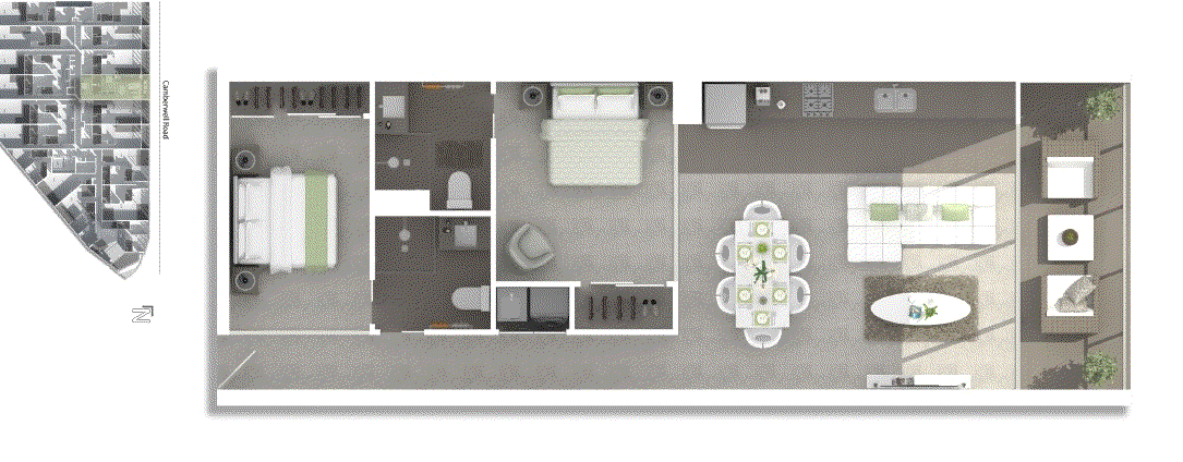 - Spacious open-plan lounge and dining area leading onto large private balcony