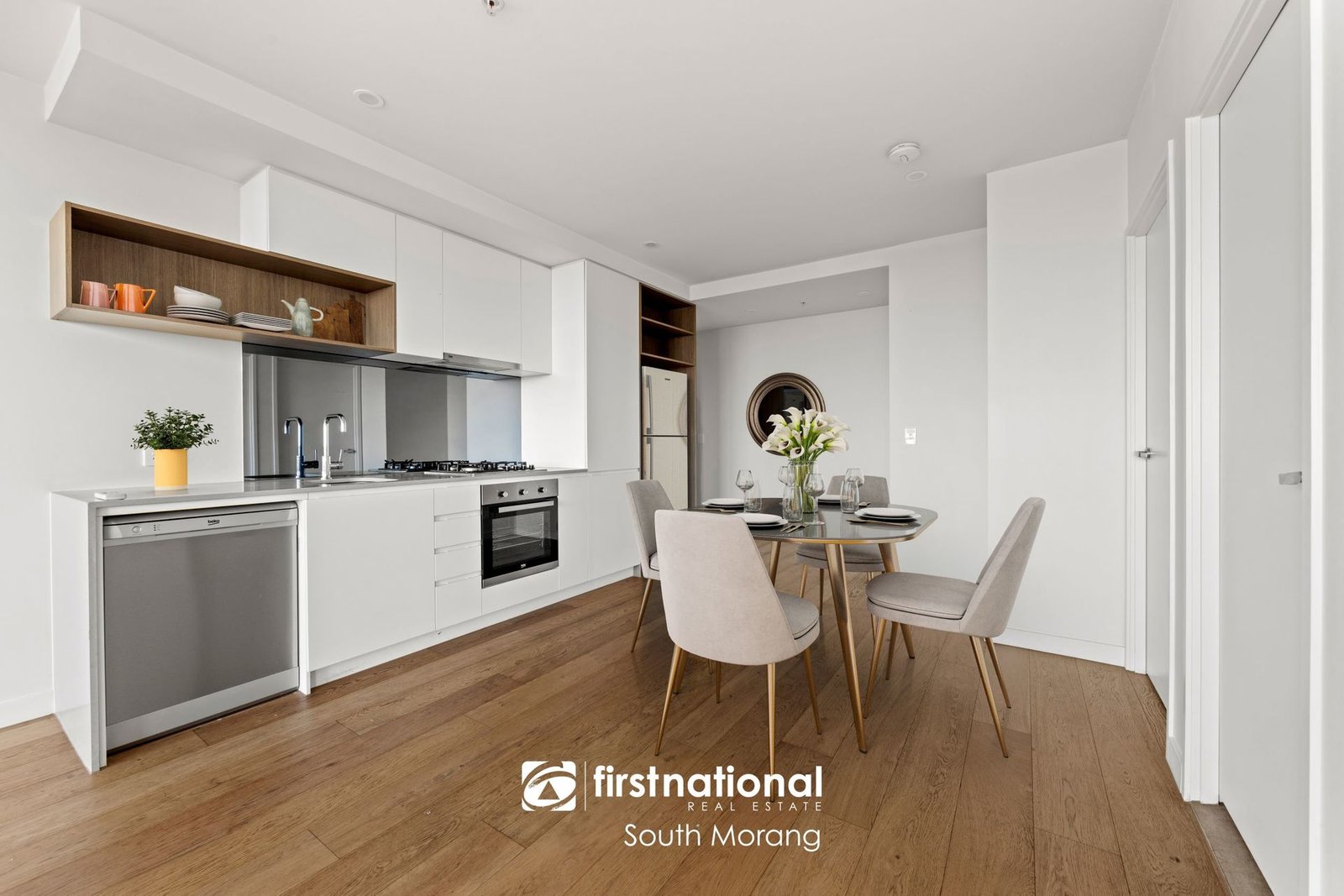Timber floors, neutral-toned walls, carpet and natural light, enhance the generous dimensions of an open plan living area anchored by a stone finished kitchen (mirror splashback, dishwasher and stainless steel appliances.