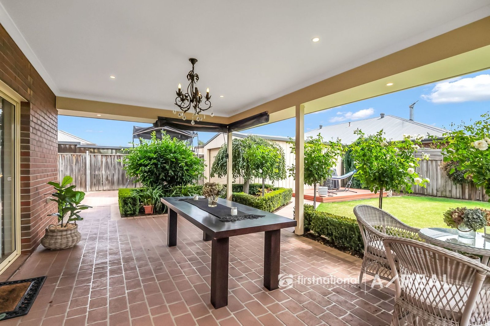 The stylish kitchen is fitted with timber cabinetry, sleek granite countertops, quality stainless steel appliances, and a large pantry. It seamlessly flows into the north-facing covered alfresco area, perfect for year-round outdoor living, with a large backyard providing plenty of space for children and pets to play.