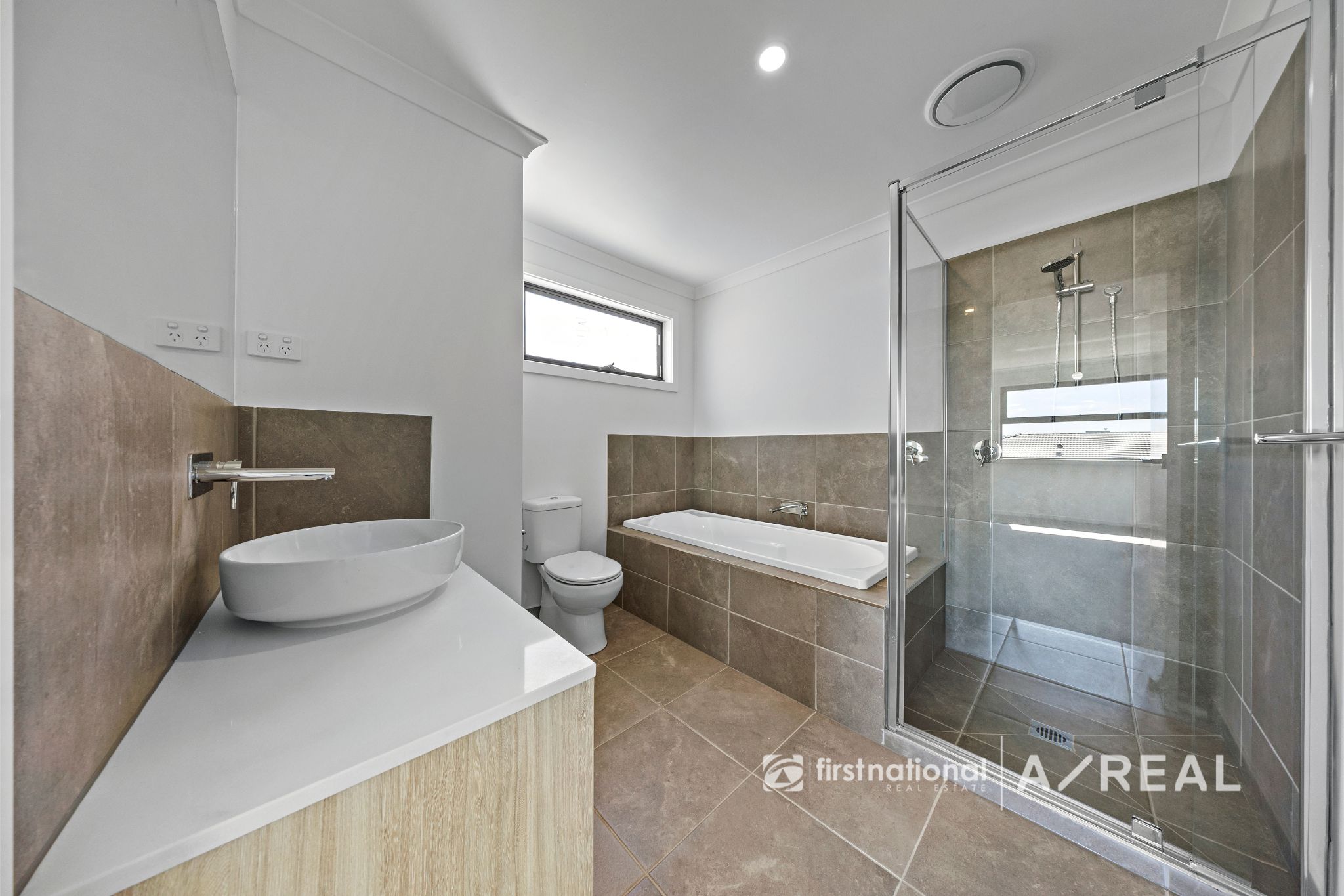 A modern central bathroom, with the master suite offering a built-in robe and ensuite. Inside, timber flooring, tiled wet areas, and soft carpeting in bedrooms create a luxurious atmosphere, while LED downlights brighten the space.