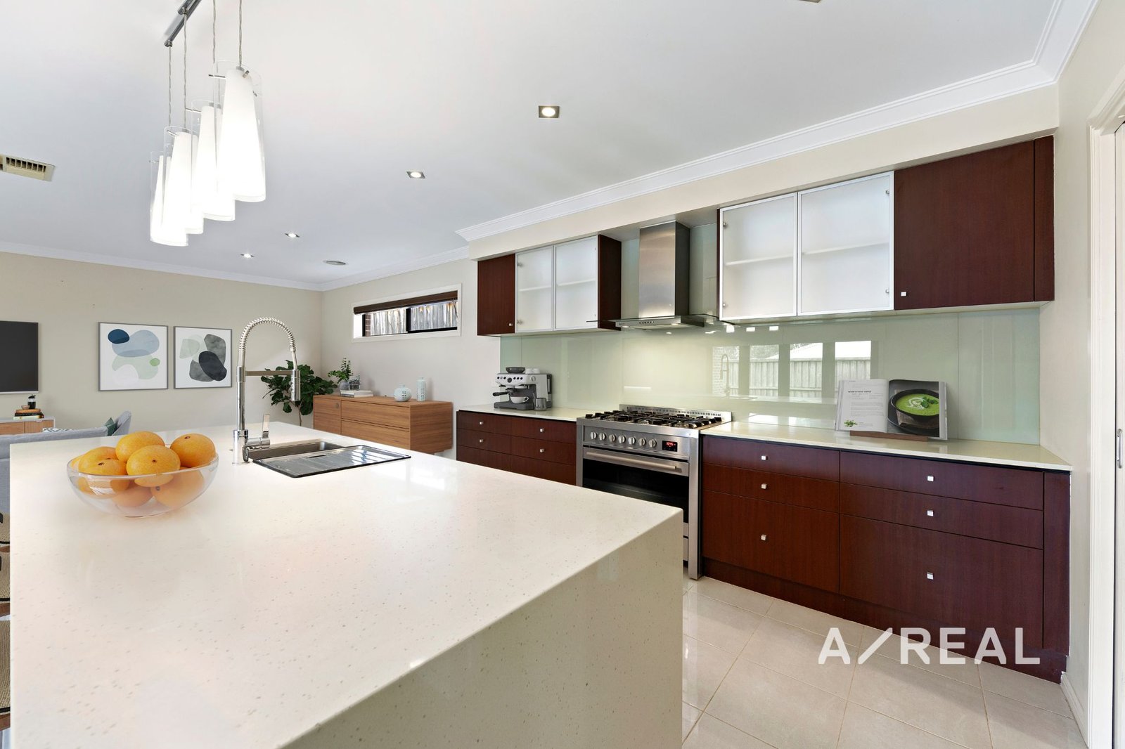 The kitchen is a true highlight, boasting luxurious stone countertops, a 900mm freestanding gas stove and oven, a stylish glass splashback, a plumbed fridge space, and an impressive butler's pantry. Additional features include a double garage with internal access and a fantastic covered BBQ area with wide merbau timber decking, perfect for entertaining. The low-maintenance backyard also provides a lovely space for a hobby garden.