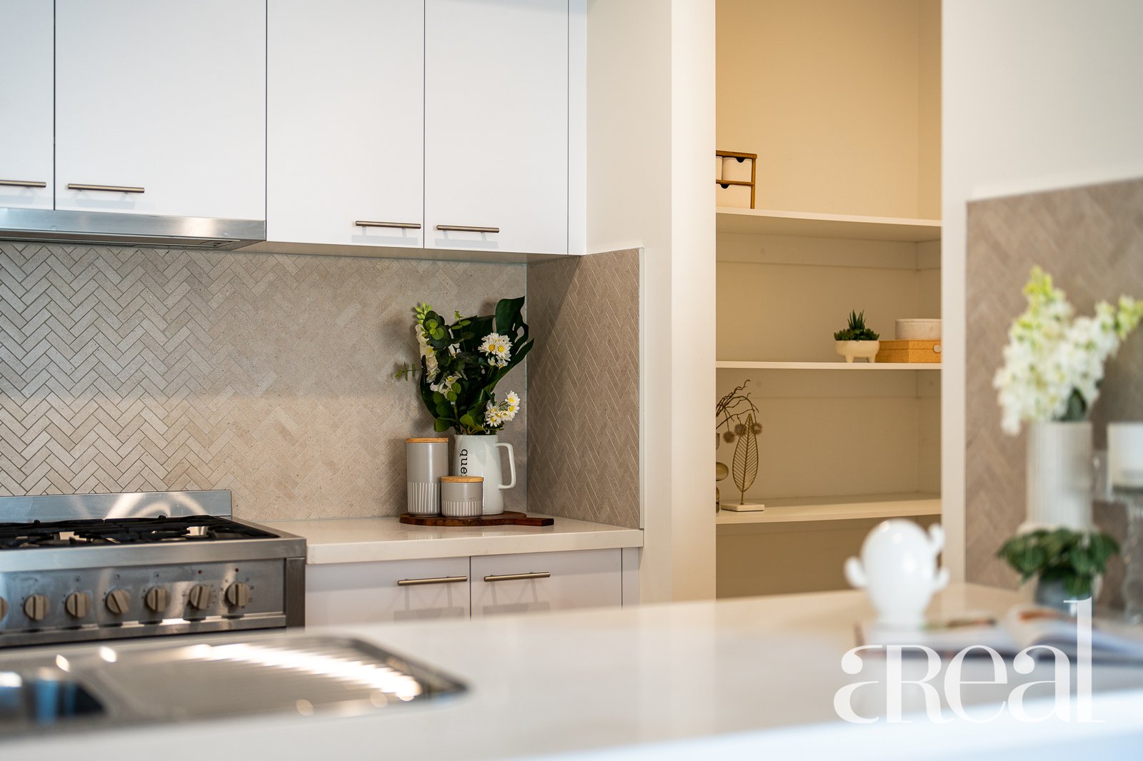 - kitchen has long benchtops, a dual sink and modern appliances
