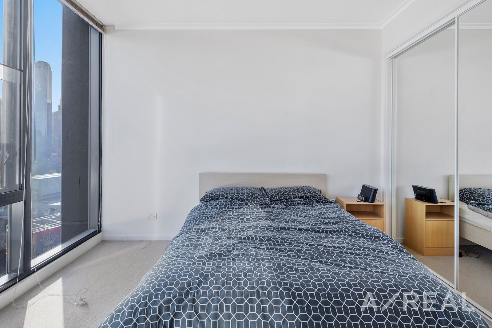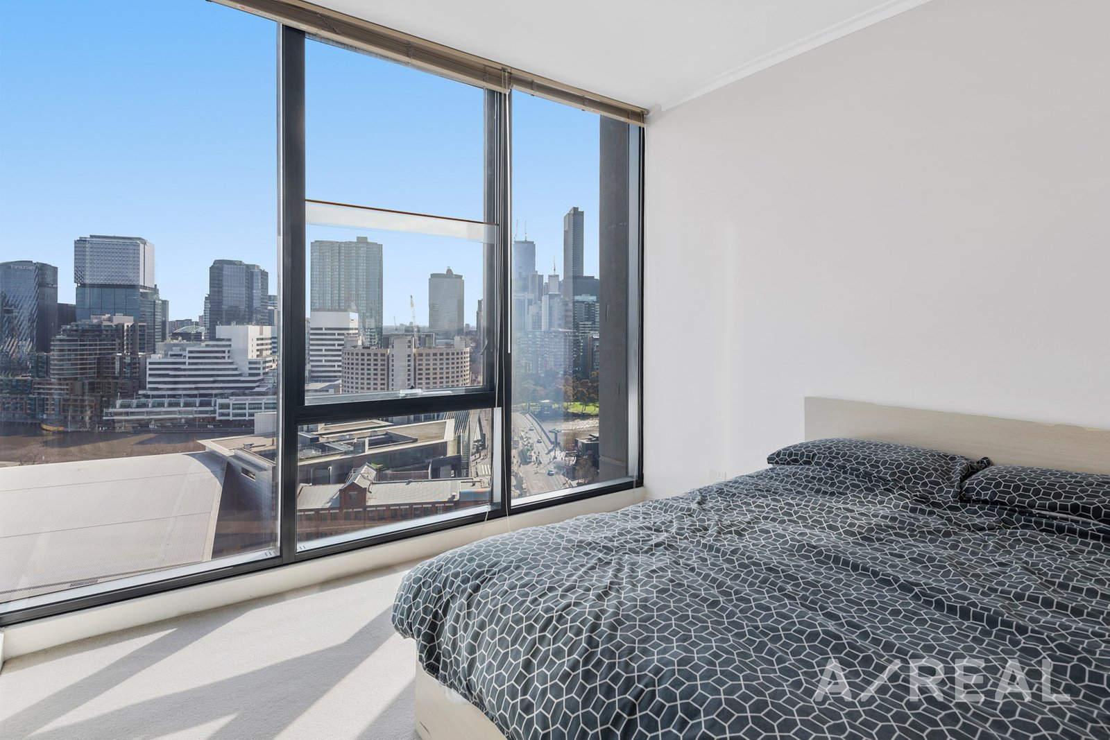 Floor to ceiling windows provide views over the river and across the city skyline., which can be enjoyed every morning from the comfort of bed. A large double mirrored wardrobe provides storage.