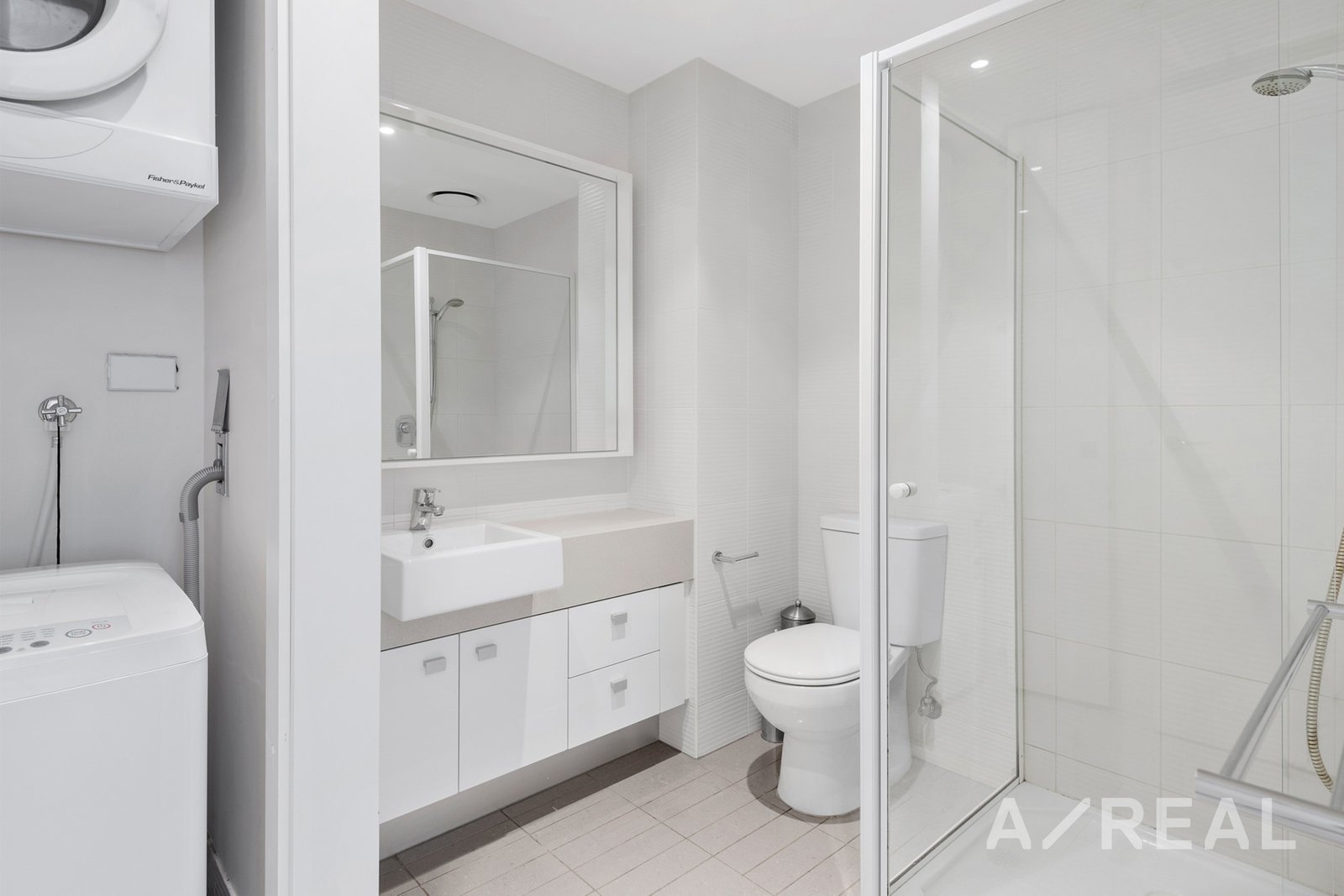 - Bathroom with laundry facilities including washing machine and dryer