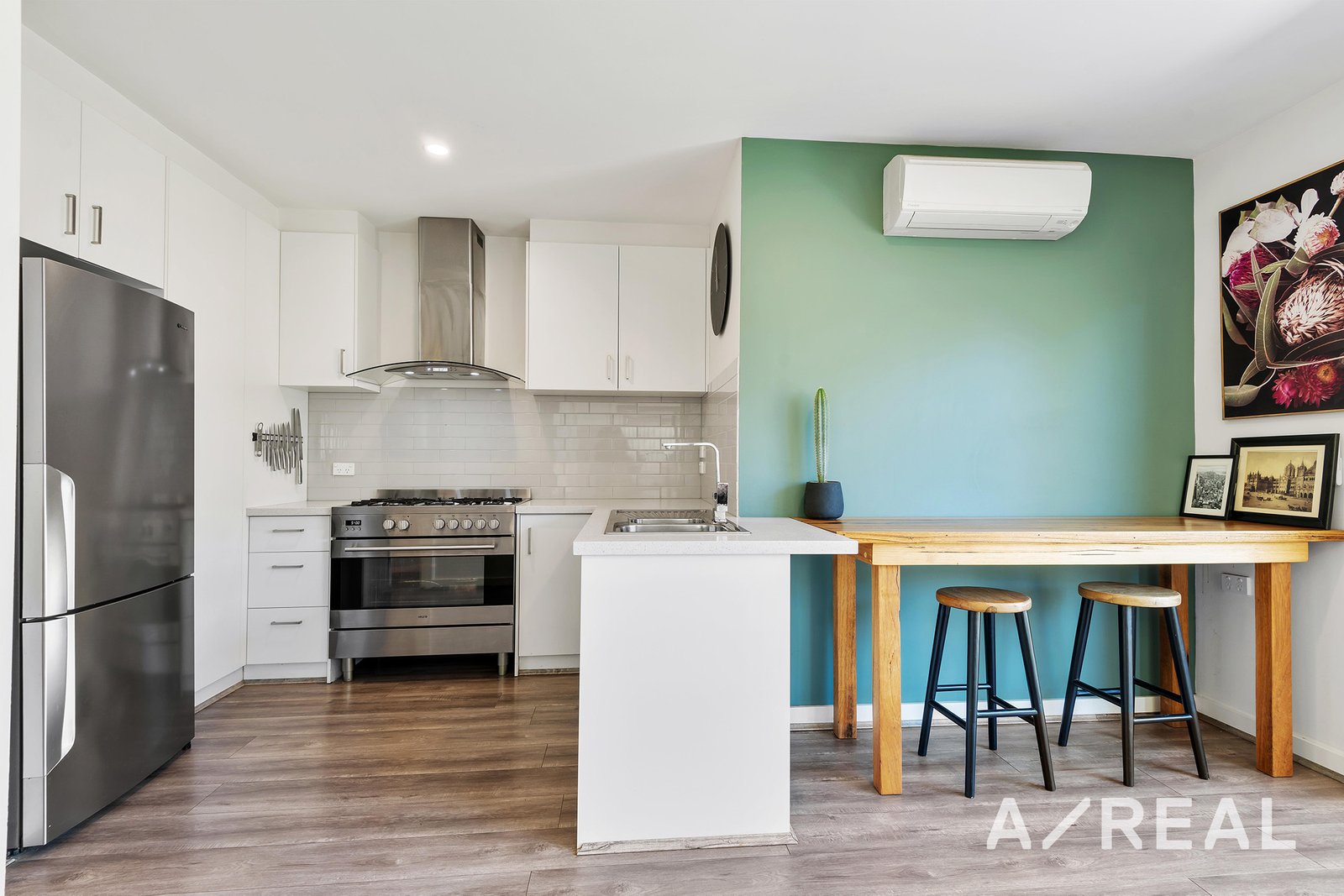 This property offers a spacious open-plan living, dining, and kitchen area on the ground floor, complete with a custom-made breakfast bar and a split-system air-conditioning/heating system. The kitchen is modern and well-appointed, featuring a larger 900mm freestanding oven, gas cooking, a dishwasher, and stone benchtops. On the lower level, there is a convenient guest powder room.