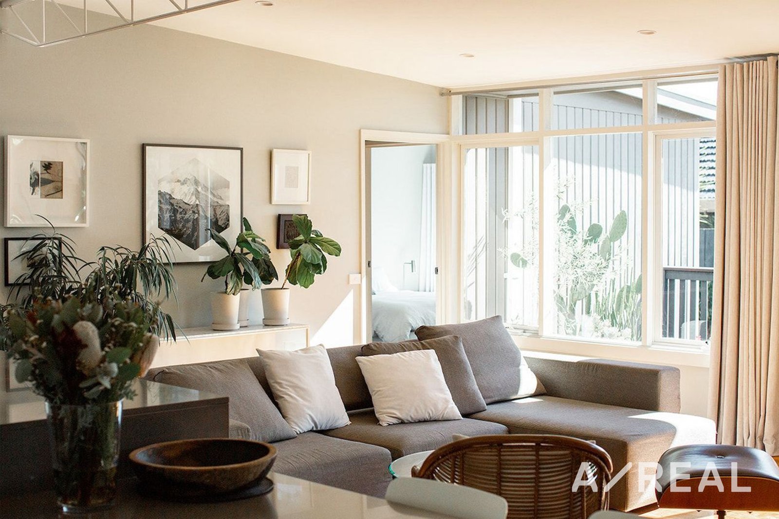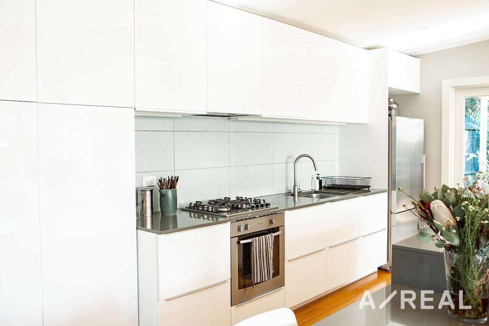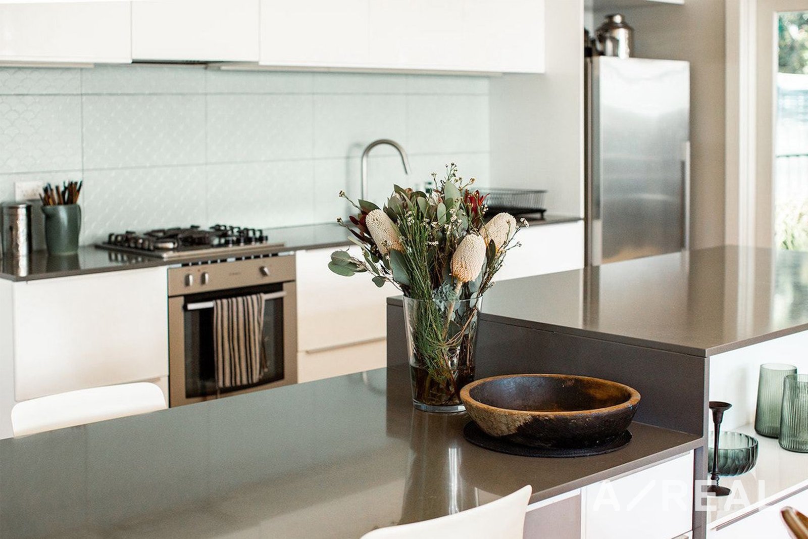 Step inside to find a well-lit and spacious interior, with a central chef's kitchen serving as the focal point. Featuring stone benchtops, stainless steel appliances, and a large island bench, this kitchen overlooks a generous open plan living and dining area, perfect for relaxation and entertaining guests.