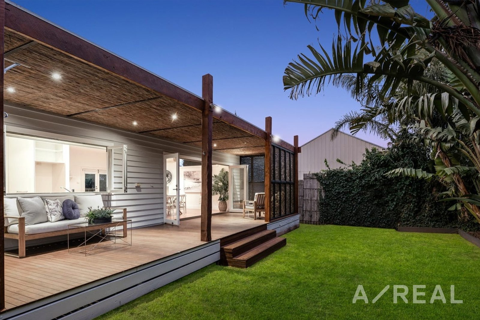The full-length timber bi-fold doors act as a gateway to the outside, revealing a Merbau deck that surveys a beautifully landscaped, resort-style garden. This seamless fusion of indoor and outdoor spaces ensures every gathering is memorable.