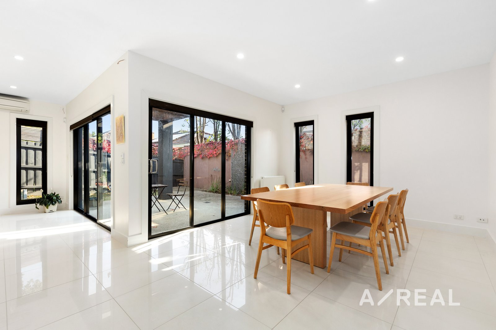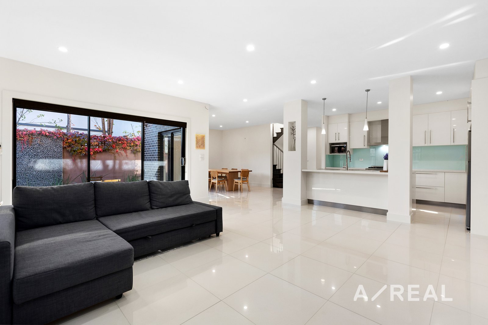 Floor-to-ceiling stacker doors seamlessly merge indoor and outdoor living, leading to a sheltered outdoor patio and lush, low-maintenance gardens, perfect for al fresco dining and relaxation. Upstairs, the luxurious master bedroom offers a private retreat with a walk-in robe and ensuite, accompanied by two additional robed bedrooms and a fully tiled family bathroom.