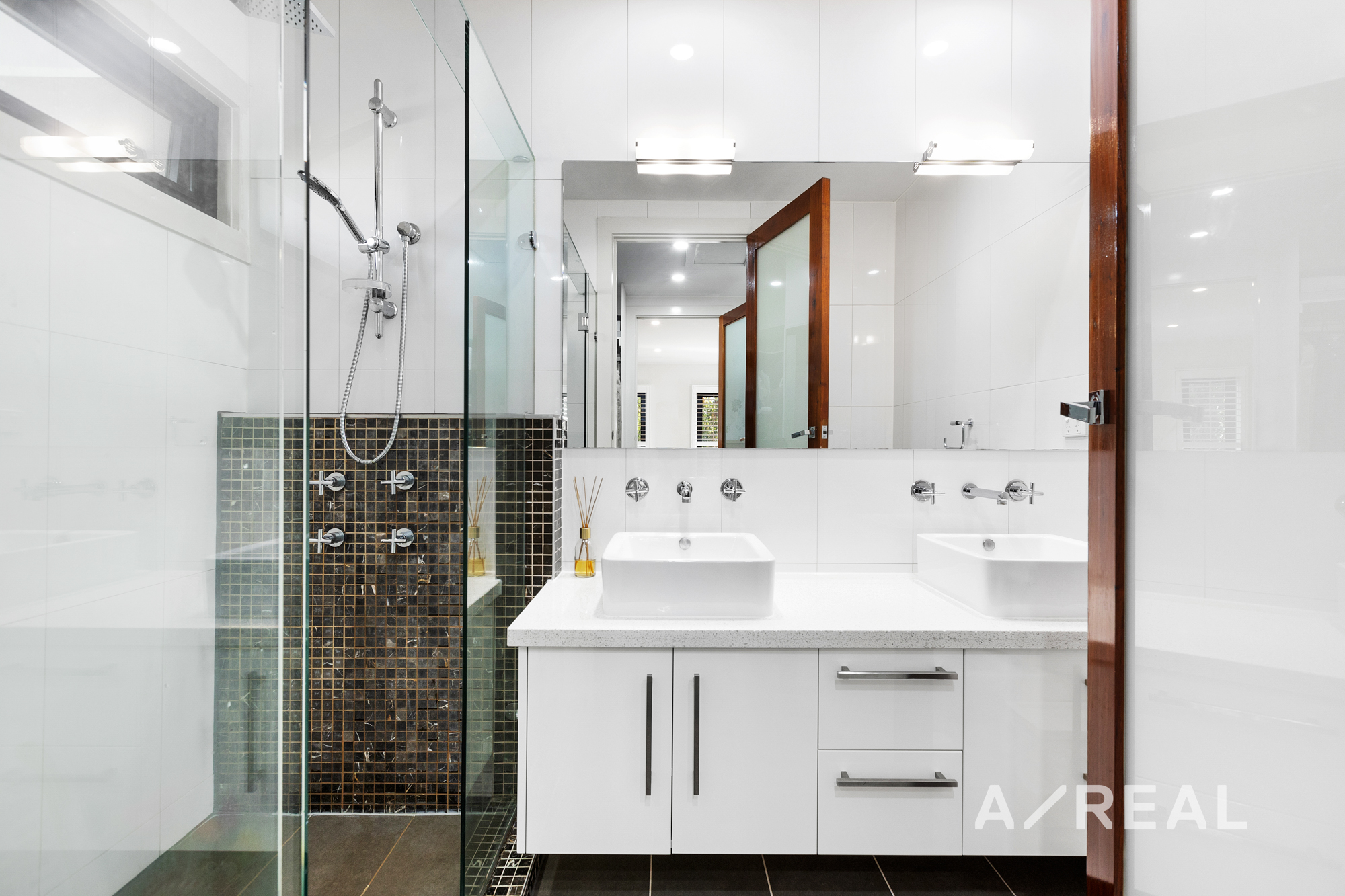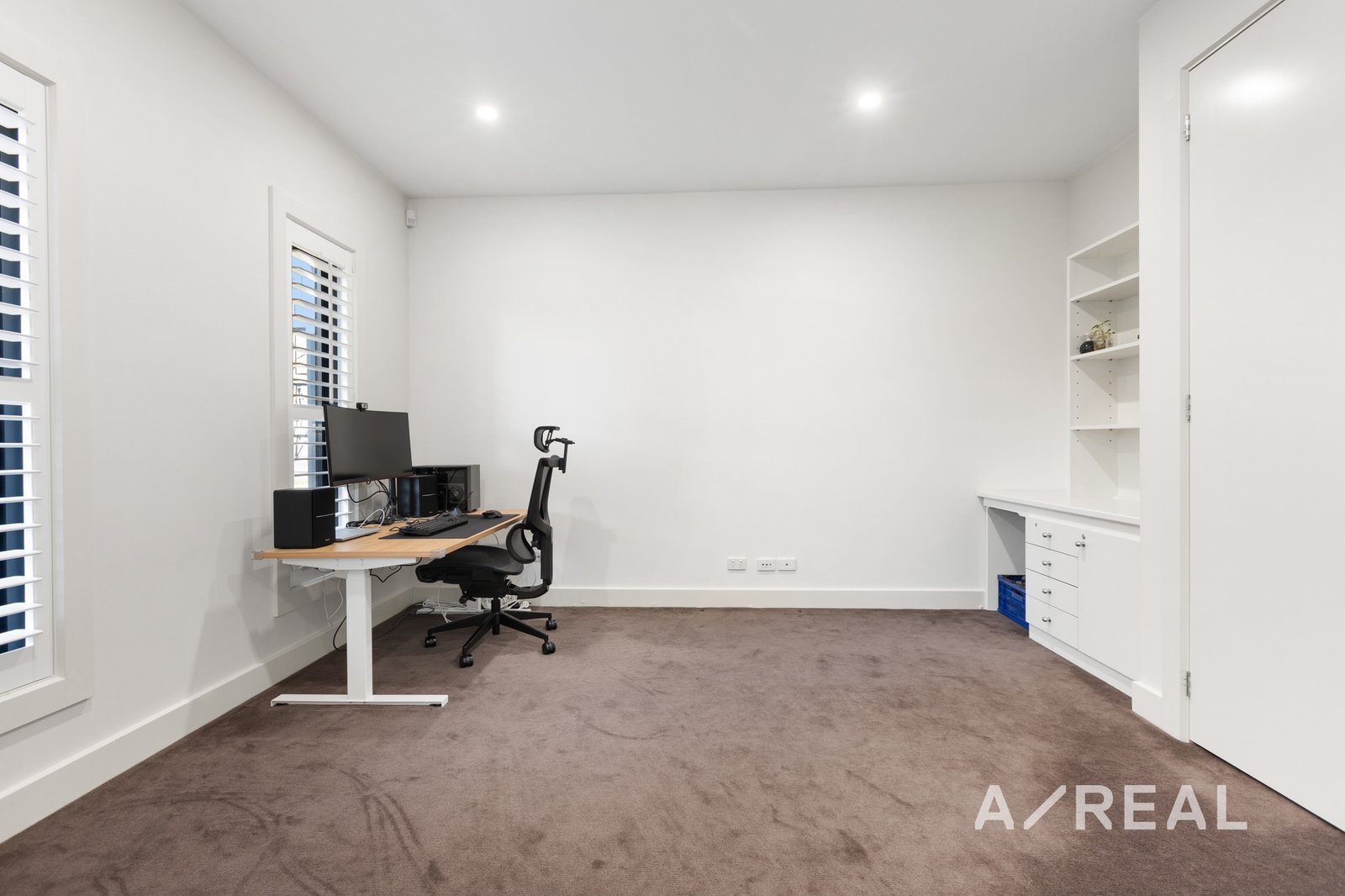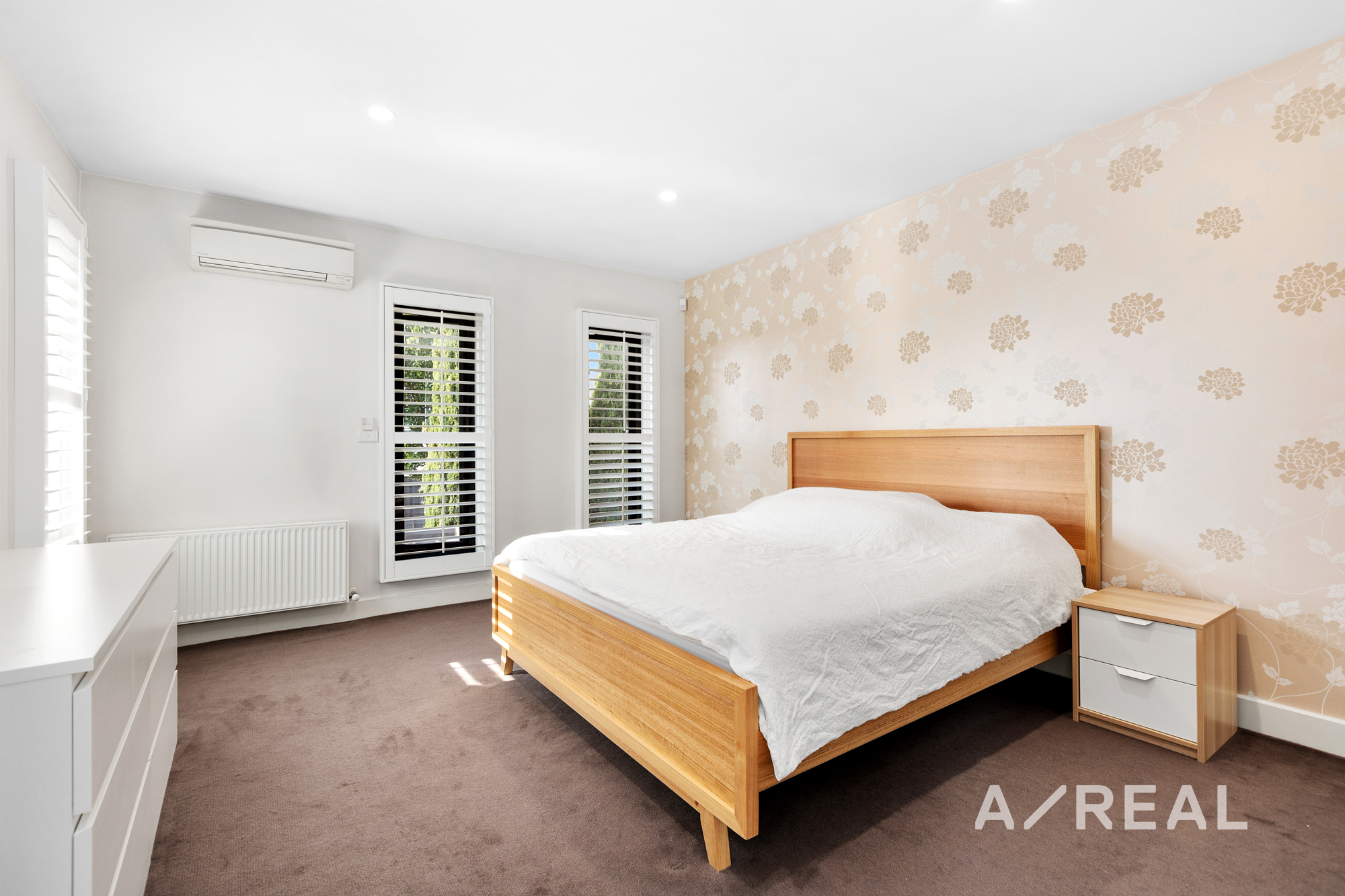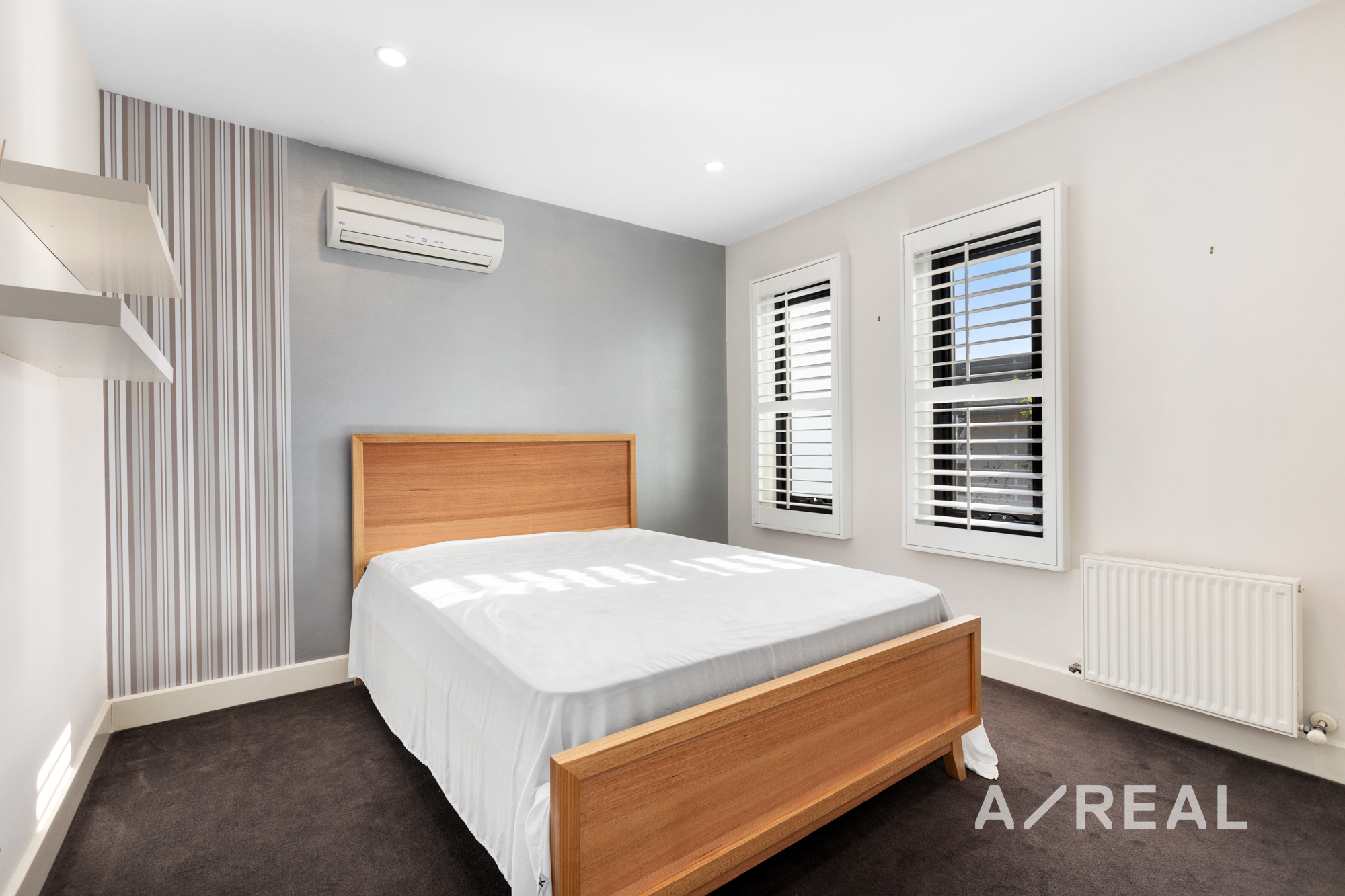 A ground-floor bedroom, complete with fitted robes and a bespoke study desk with shelving, provides versatility for guest accommodation or home-based work. Additional features include a guest powder room, a laundry, and a double garage. This home caters to modern living with hydronic heating, split-system air-conditioning, security alarm and video-intercom entry.