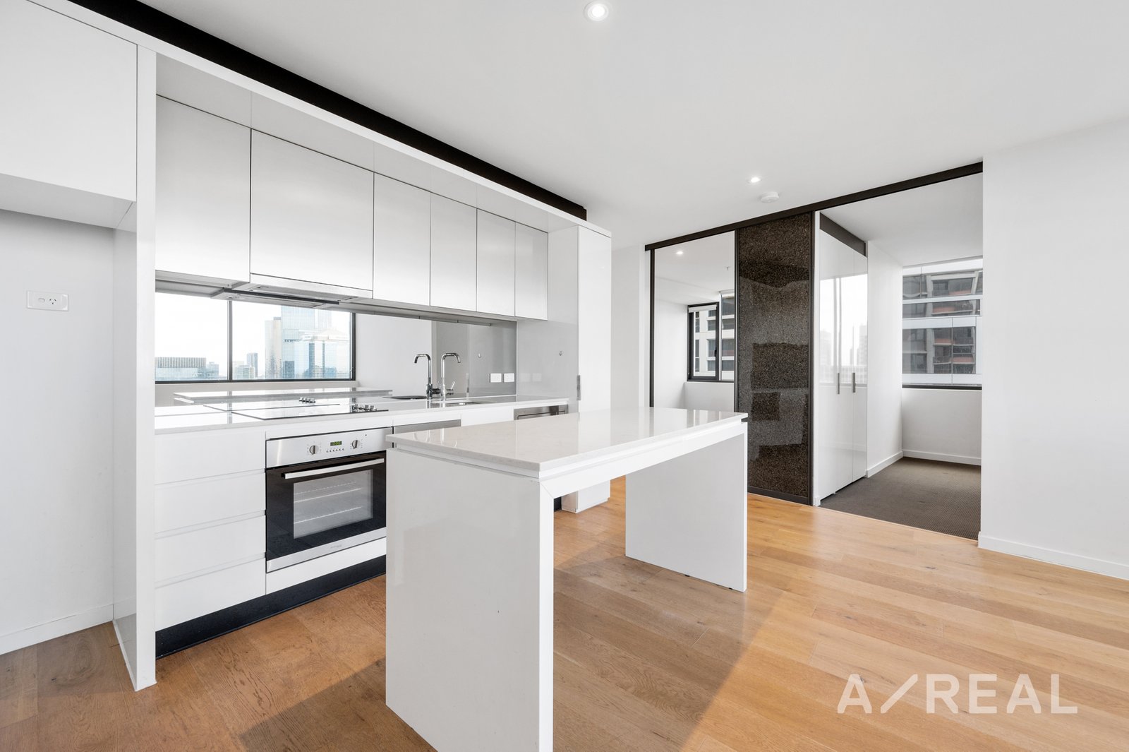 This vibrant two-bedroom apartment is located in one of the newest 52-storey additions to the Upper West Side apartments in Melbourne's CBD. The apartment offers a sleek modern design throughout and boasts breathtaking views. The kitchen is equipped with stainless steel appliances, including an electric fan-forced oven, electric glass stove top, built-in microwave, and dishwasher. The mirrored glass splash back and foiled overhead cabinetry create a chic and contemporary atmosphere.