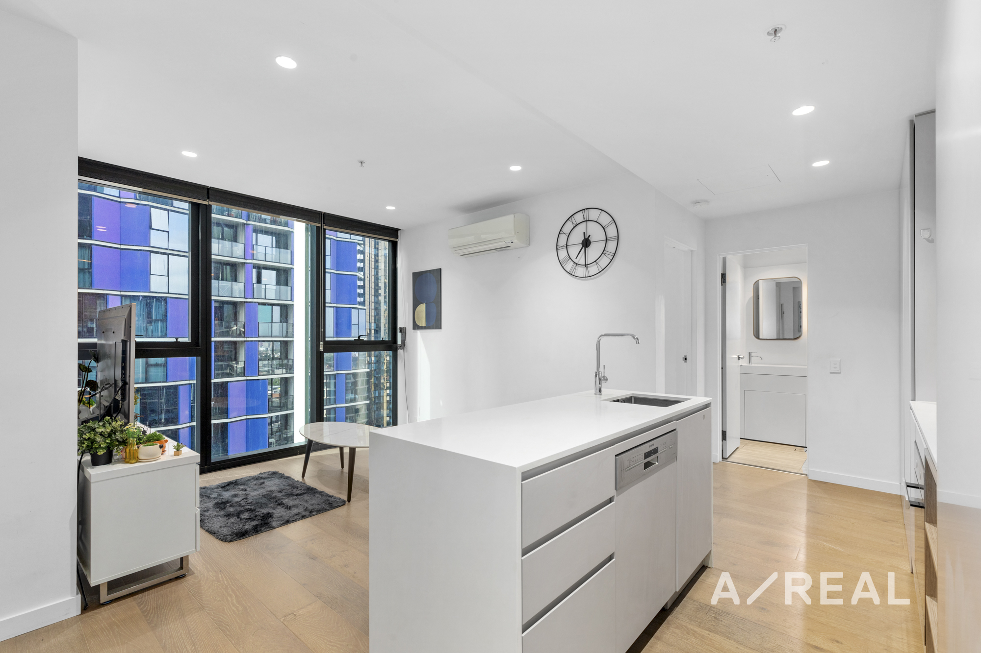 Upon entering, you'll be enchanted by the expansive floor-to-ceiling windows that invite Melbourne's vibrant ambiance day and night. The luminous bathroom, enhanced by sizable mirrors and a generously proportioned shower, complements the convenient Euro laundry, completing the scene of modern refinement.
