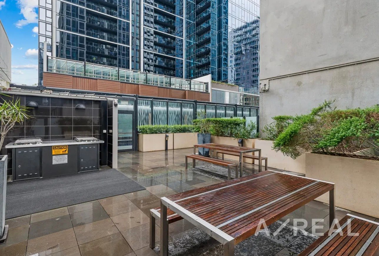 Inside, you’ll find a well-thought-out open-plan layout that flows seamlessly from the entrance to a private balcony, offering sweeping views of the CBD and Yarra River precinct. The living area is equipped with reverse-cycle air conditioning and heating to keep you comfortable year-round. The contemporary kitchen is fitted with stainless steel appliances, including a gas cooktop, microwave, dishwasher, and additional bench space—perfect for preparing meals or entertaining guests.