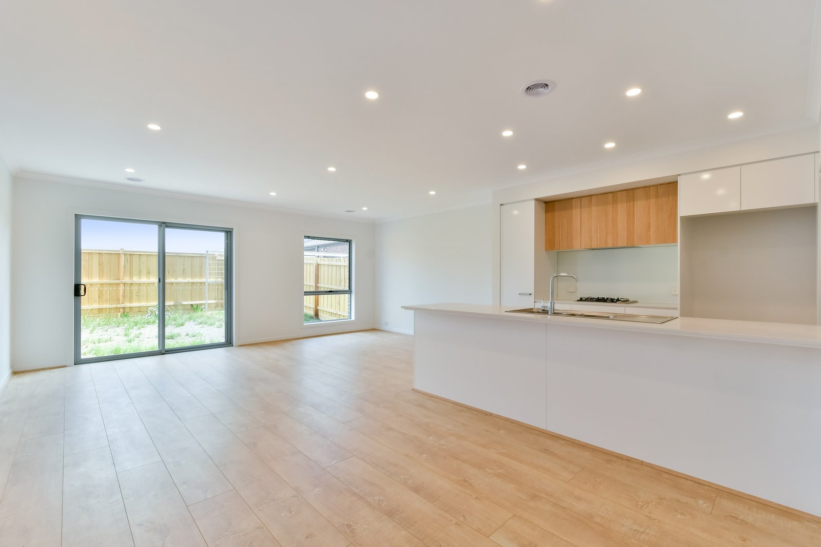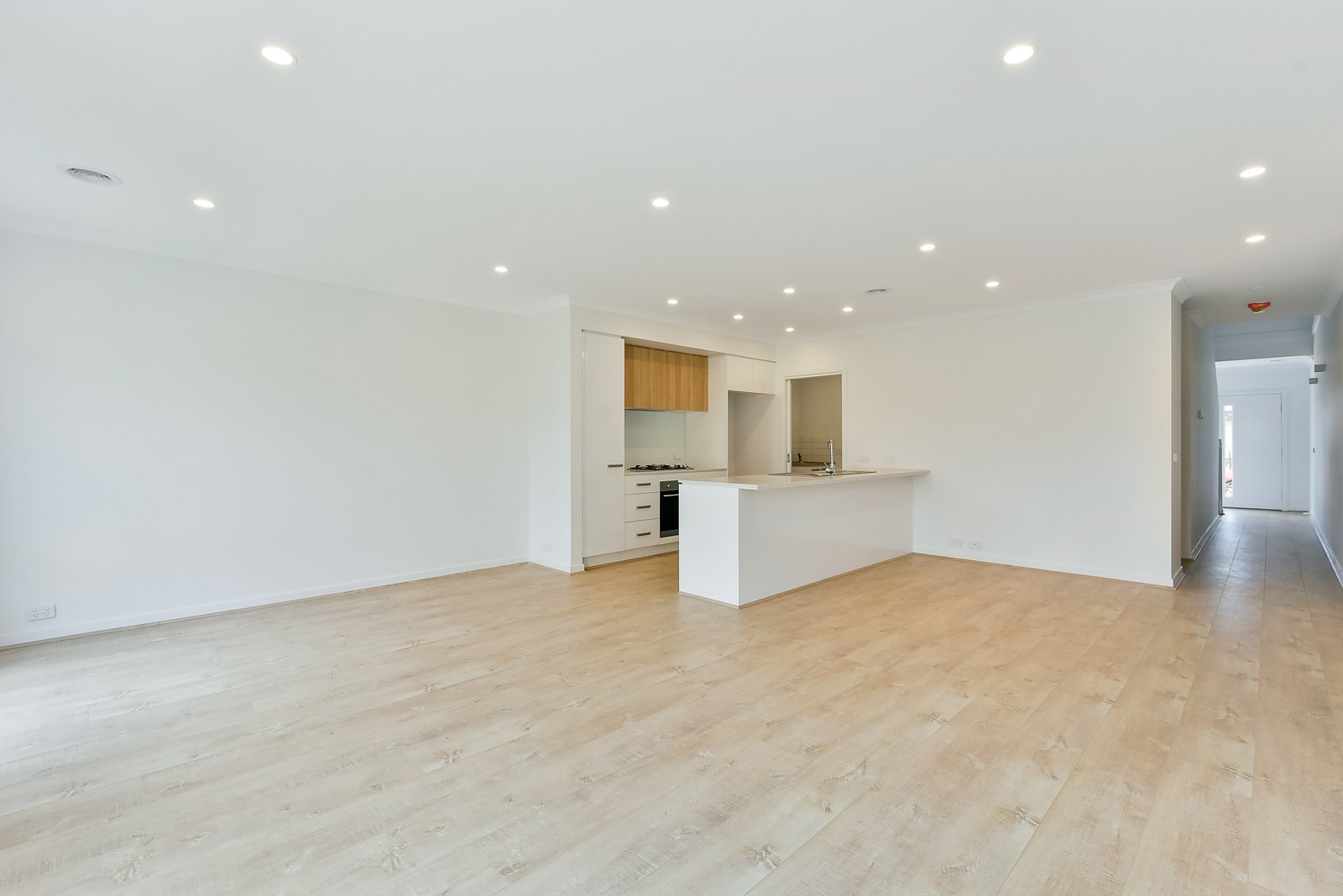 - Open plan kitchen with stainless steel appliances and ample storage.