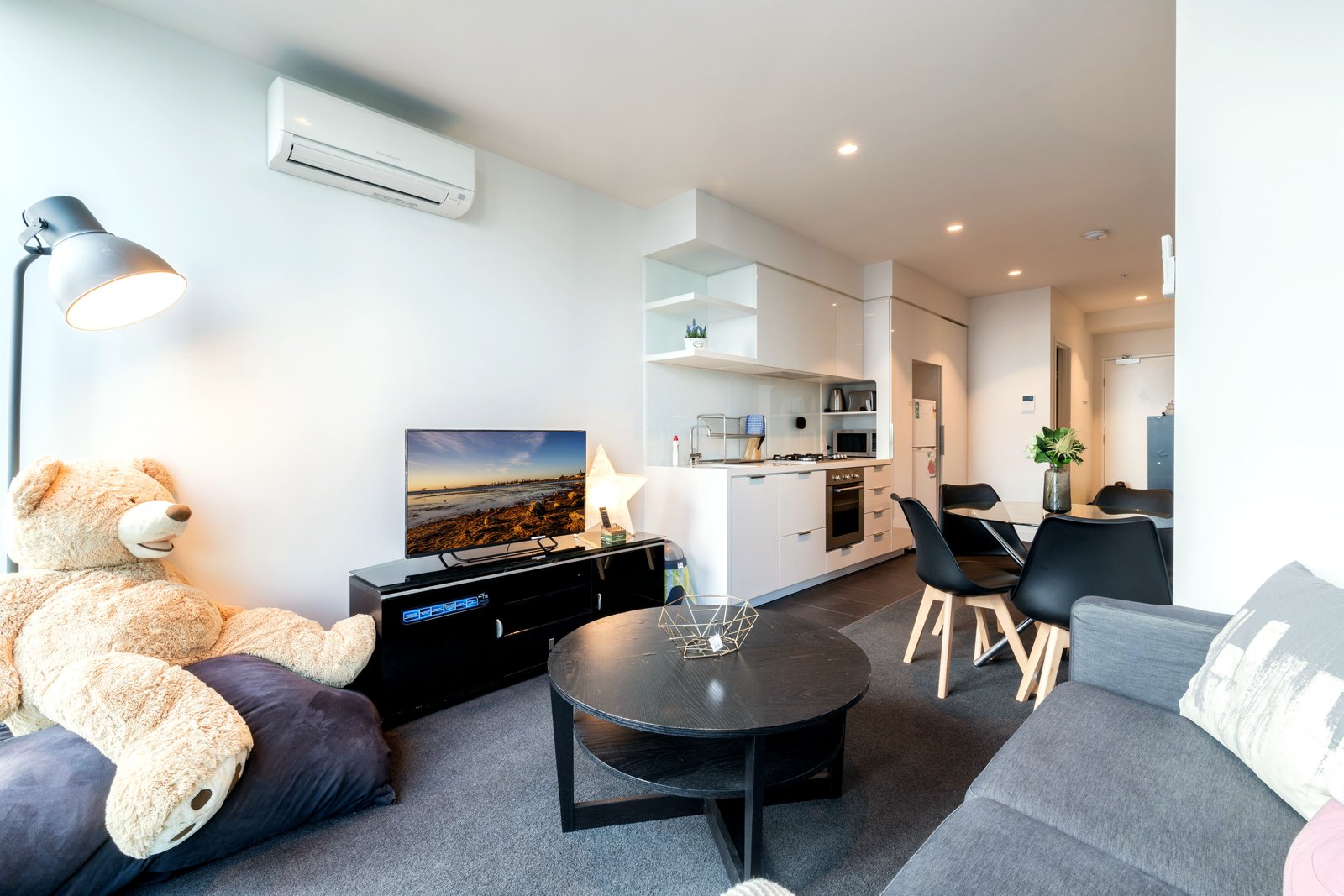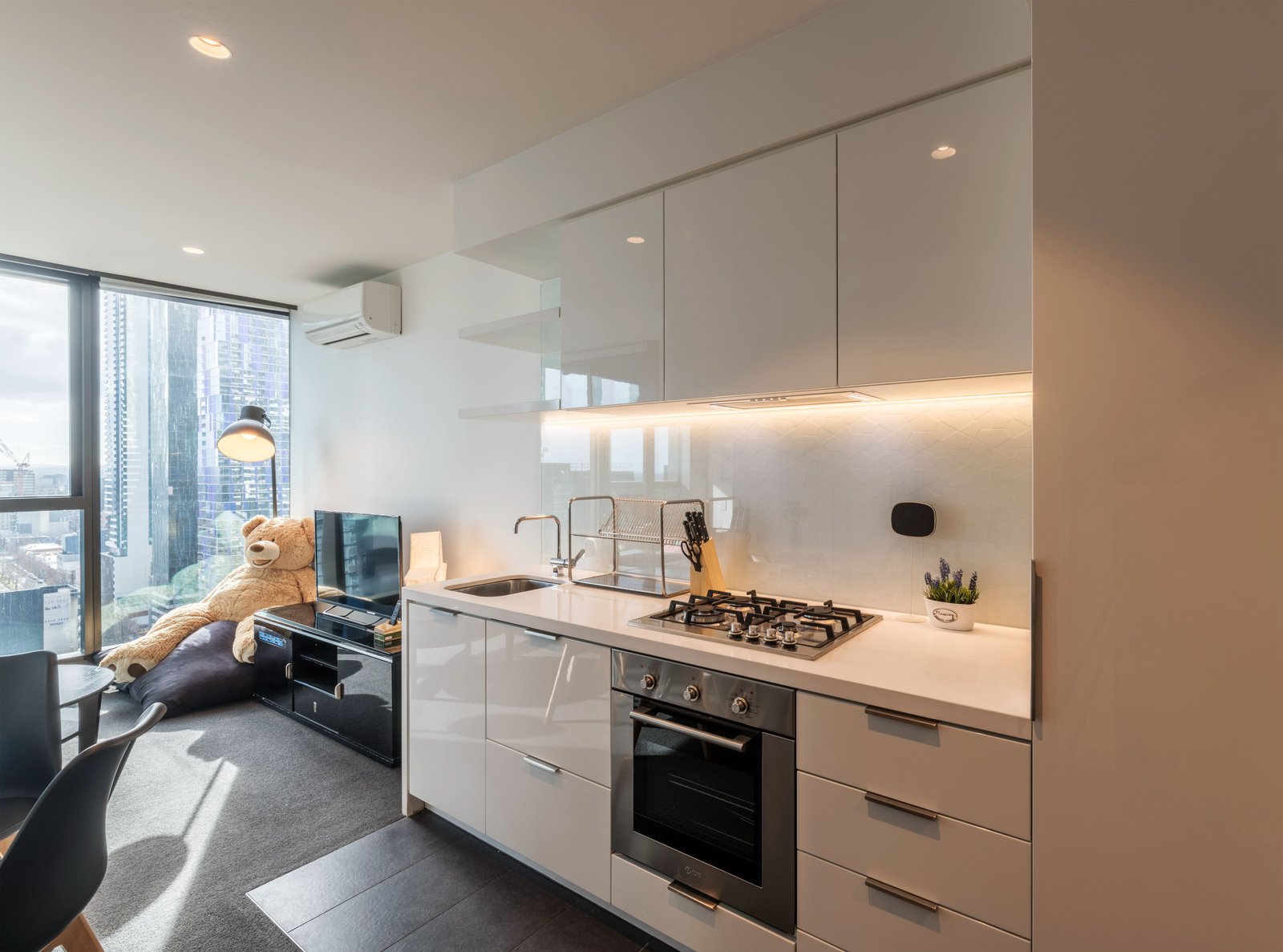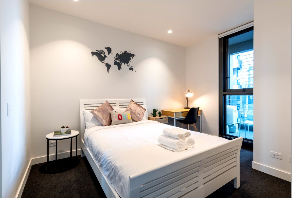 This stunning fully furnished apartment has been meticulously designed and built to service every need of inner CBD living. The living room is filled with natural light with views throughout the CBD and suburbs. The kitchen is state of the art with stone benchtop, an abundance of pantry space and stainless steel appliances including full oven, 4 burner gas cooktop and dishwasher.