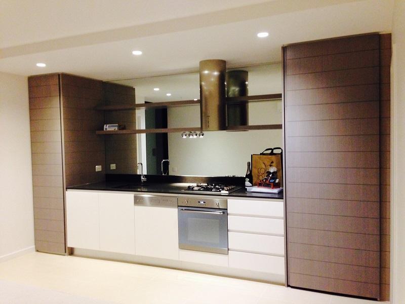 - Kitchen with stone bench tops, mirror splash back and stainless steel European appliances with gas cooking, oven and dishwasher.