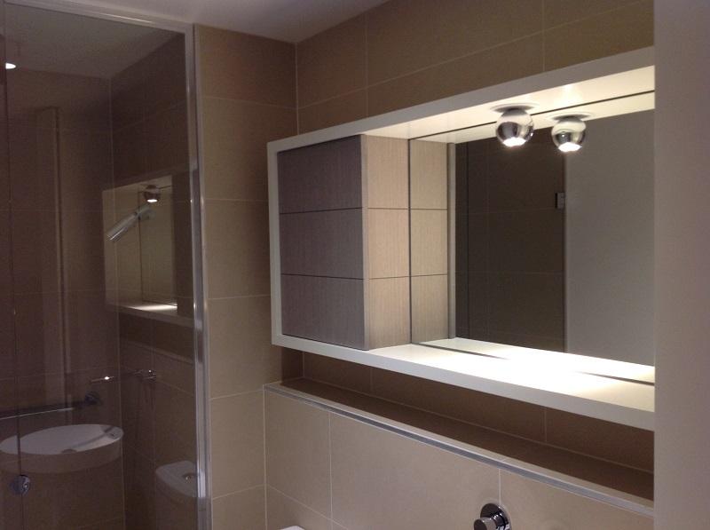 - Kitchen with stone bench tops, mirror splash back and stainless steel European appliances with gas cooking, oven and dishwasher.