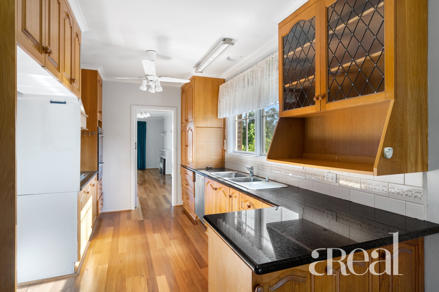 - Bright galley kitchen with timber cabinetry