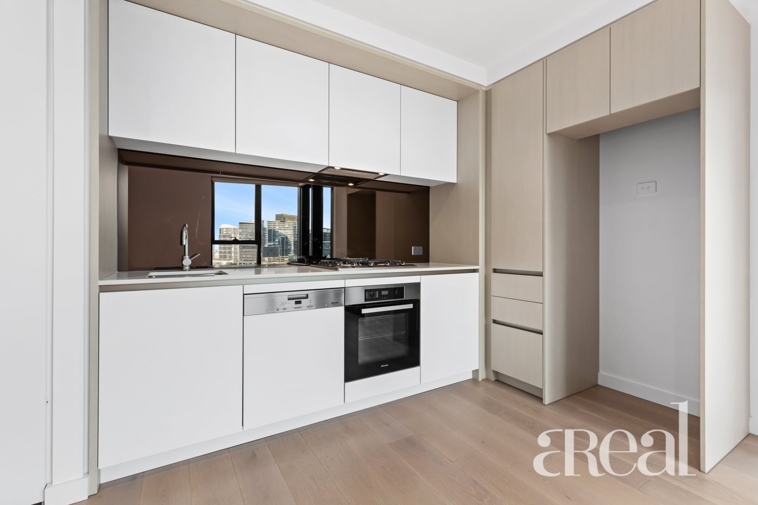 - Elegant stone topped modern kitchen with Miele stainless steel gas cooktop, oven and a dishwasher