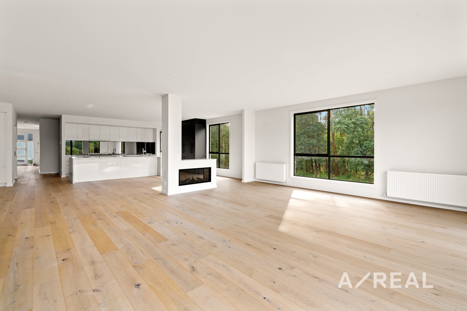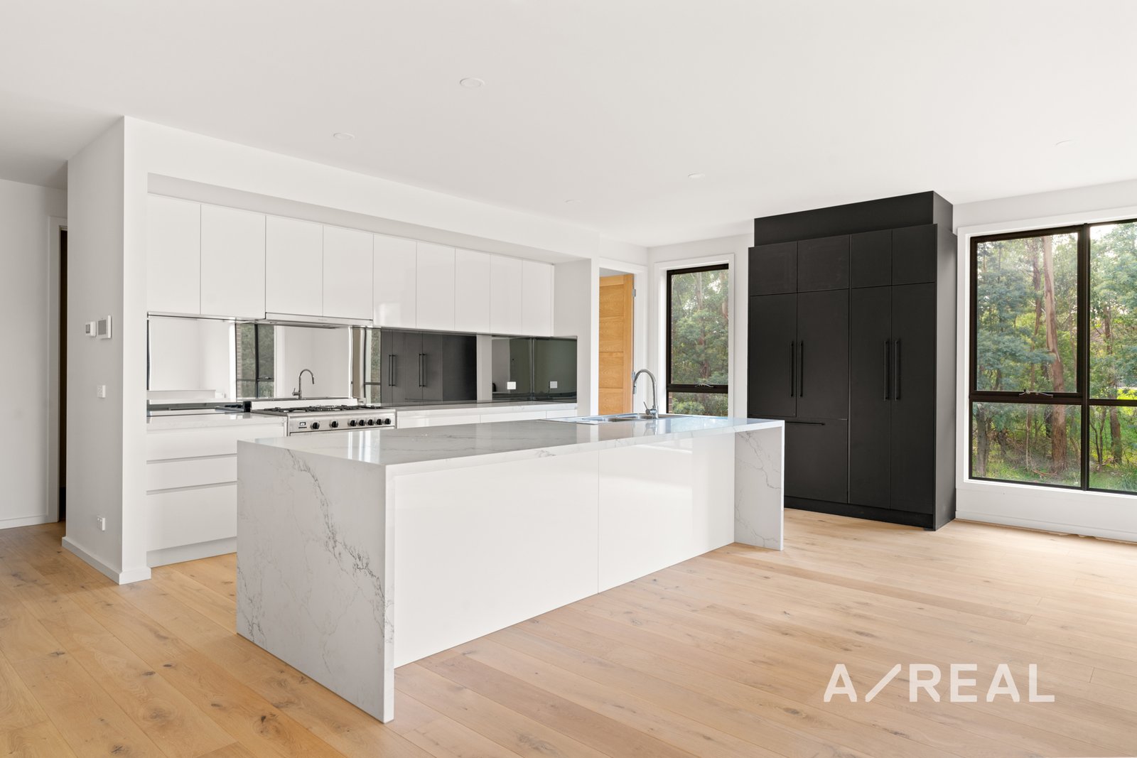 Featuring timber flooring to spacious living with high ceilings, adjoining the well-appointed and modern kitchen featuring a huge island bench with extra cabinetry, modern mirrored splashback, and high-end stainless steel appliances including oven, and gas cooktop. The spacious living area opens to another outdoor yard that overlooks the lake and is perfect for entertaining.