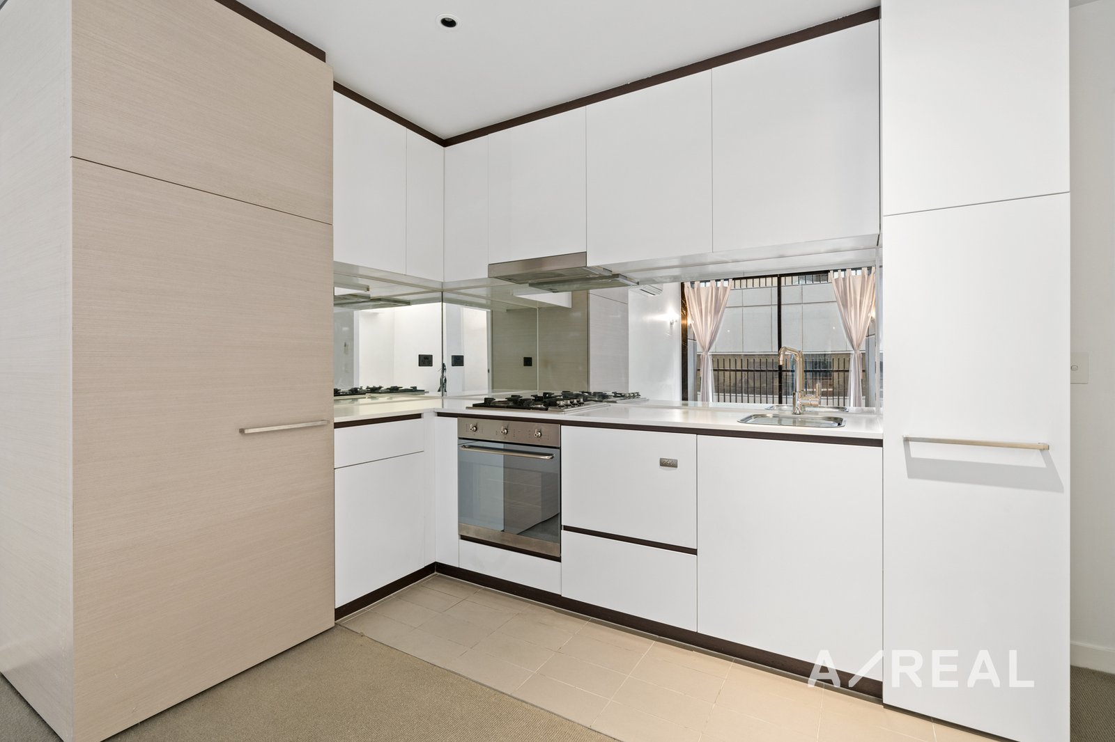 -Fully equipped Euro kitchen complete with stone benchtops, gas cooktop, oven, and mirror splashbacks