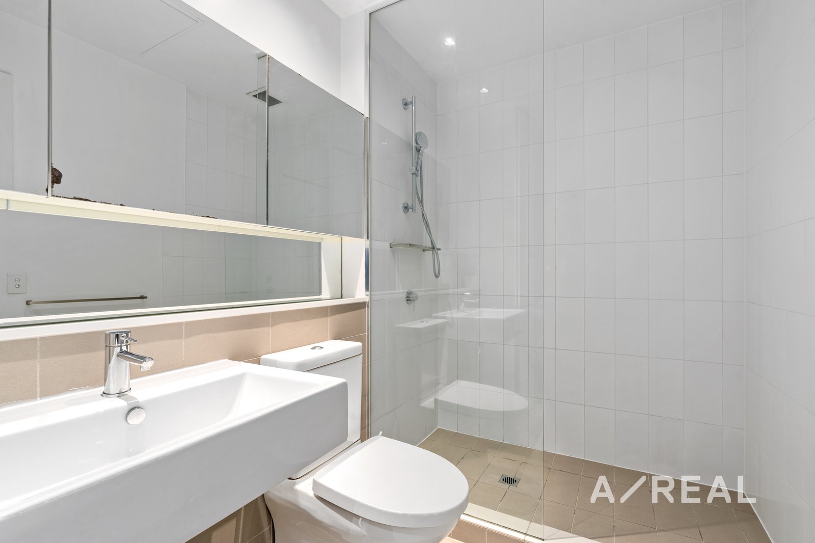 -Modern bathroom with walk-in shower and mirrored cabinet