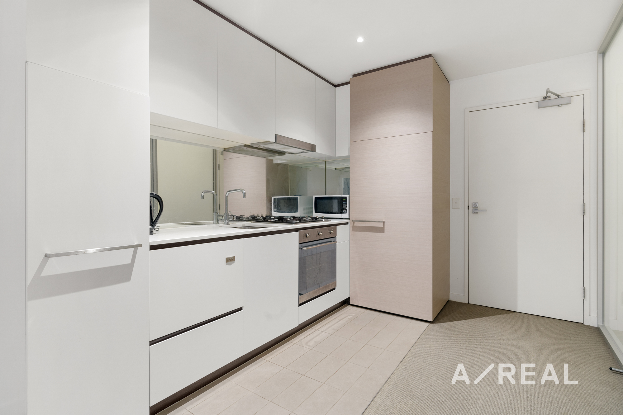 - An evocative kitchen with cool clean lines combines stone bench tops with a SMEG oven, an integrated dishwasher, integrated refrigerator, and mirrored splashback