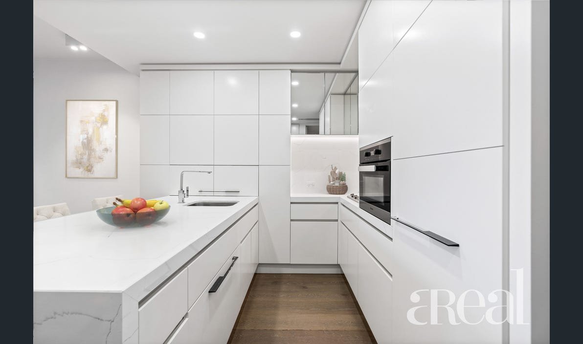 All-white cabinets and benchtops are on show in the gorgeous kitchen alongside mirrored elements and a suite of stainless-steel appliances. Modern lighting and crisp white walls add to the contemporary appeal of the unit plus there's also an internal laundry.