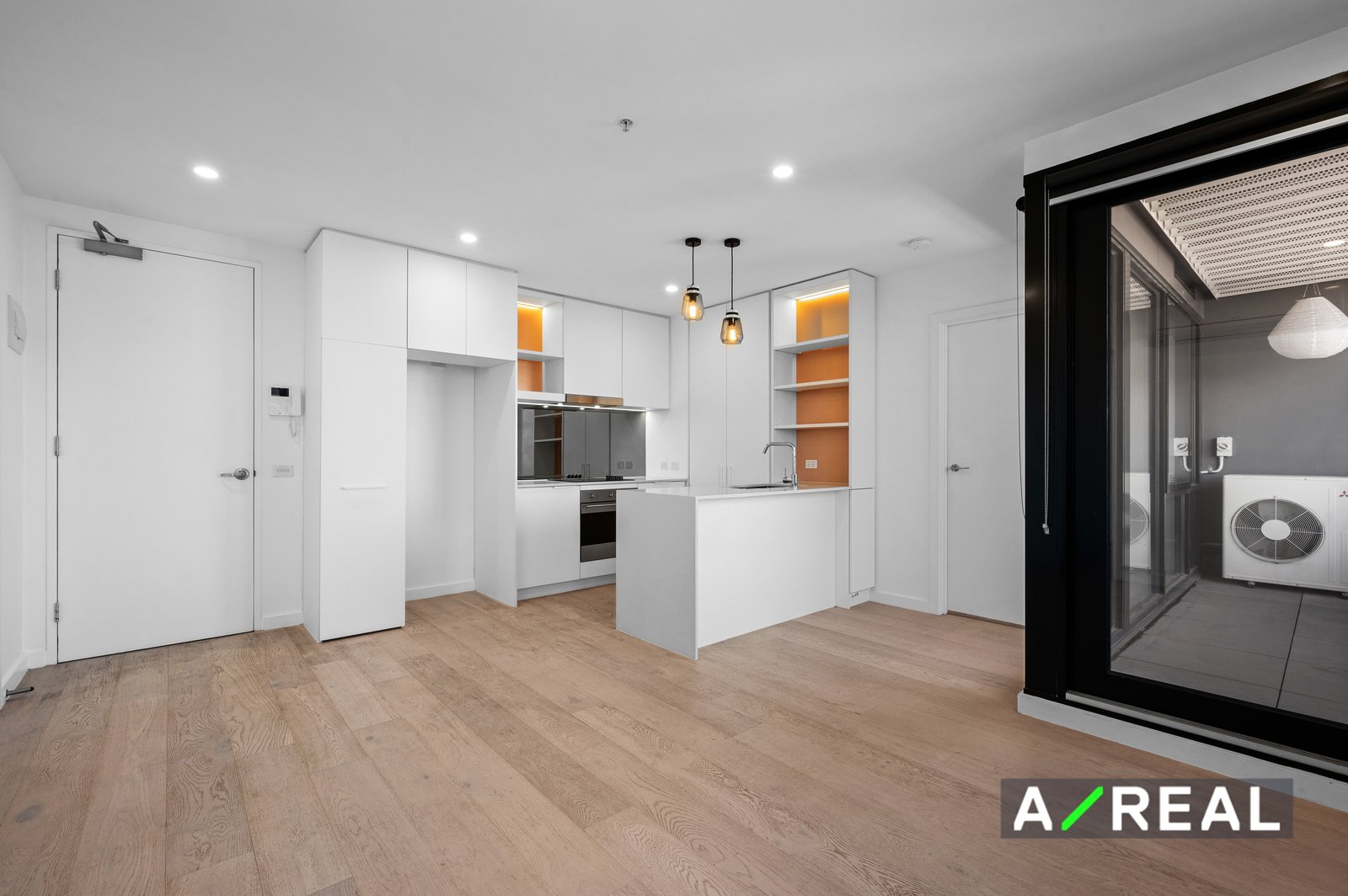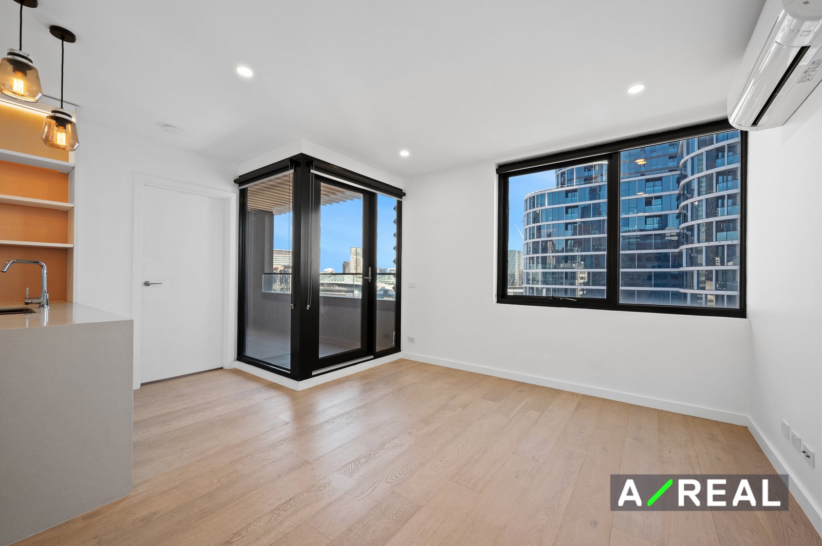 - Spacious open plan living and dining area with striking timber floorboards