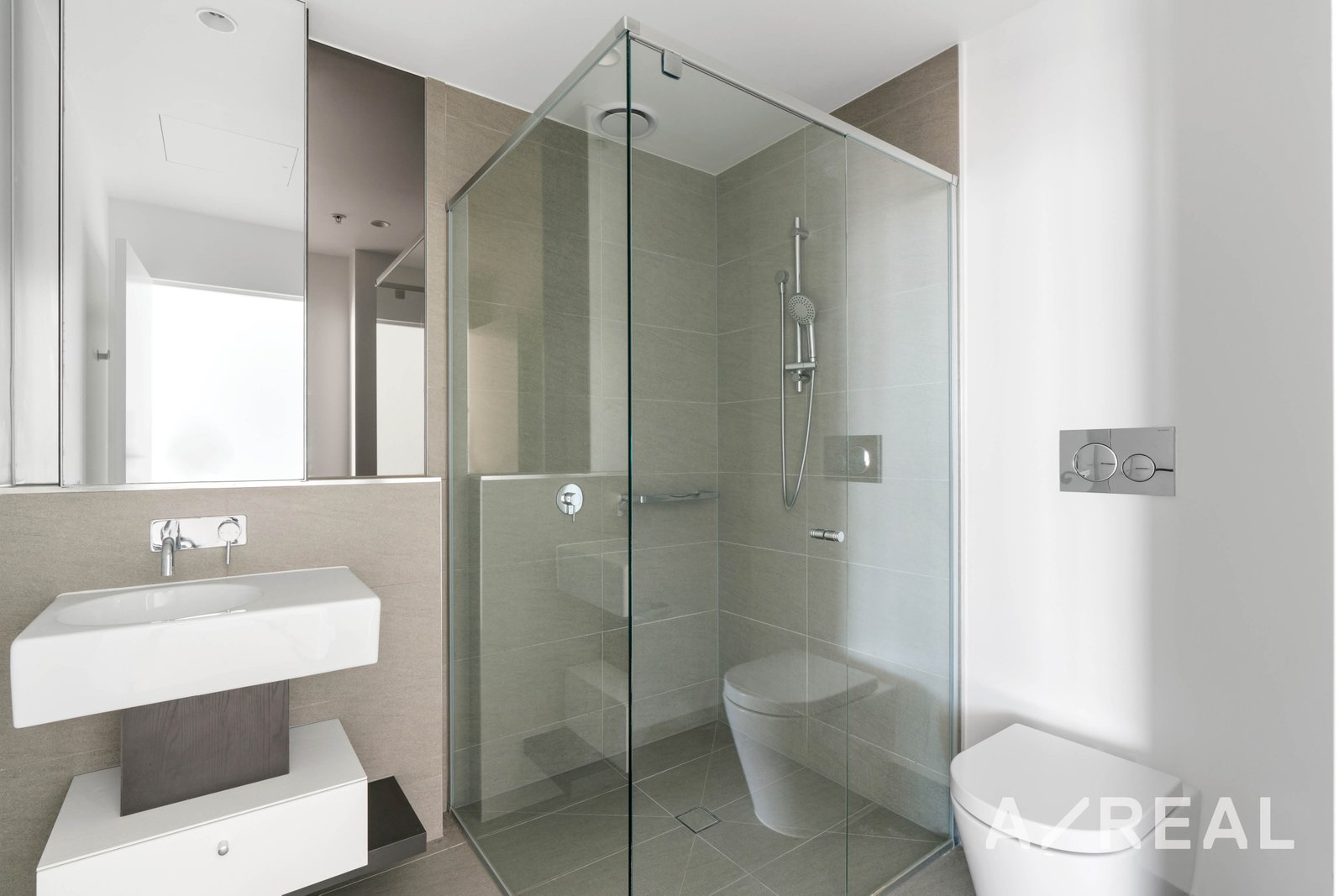Serviced by the designer central bathroom, tiled floor-to-ceiling with a walk-in shower and mirrored cabinets above the stone vanities.