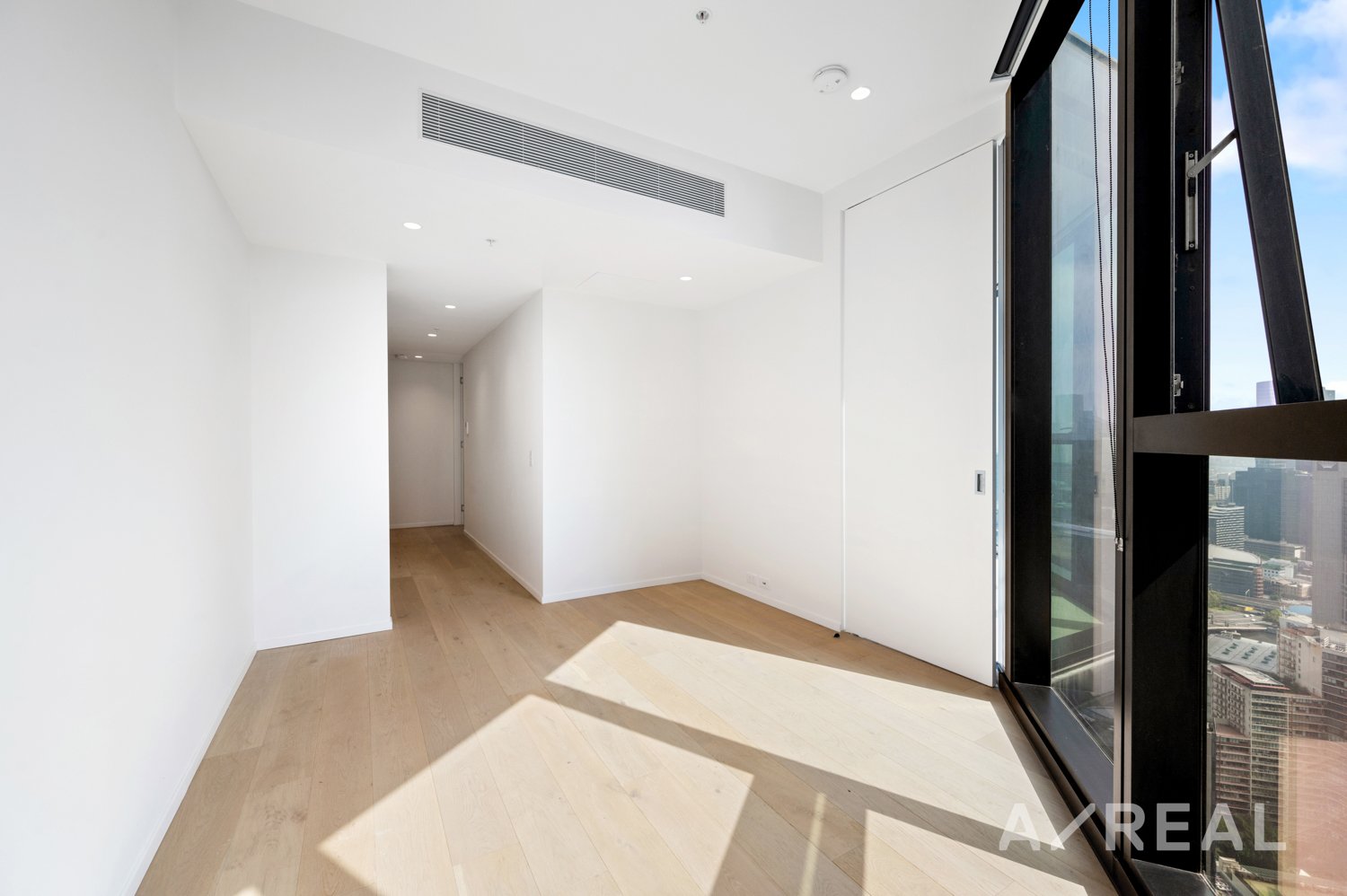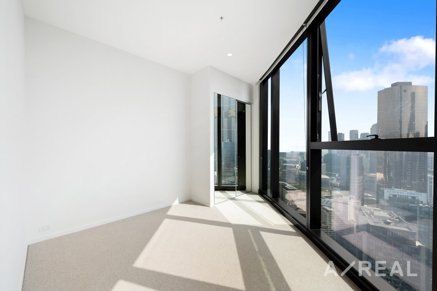 The main living room area and the bedroom with floor-to-ceiling windows boast incredible views of the city.