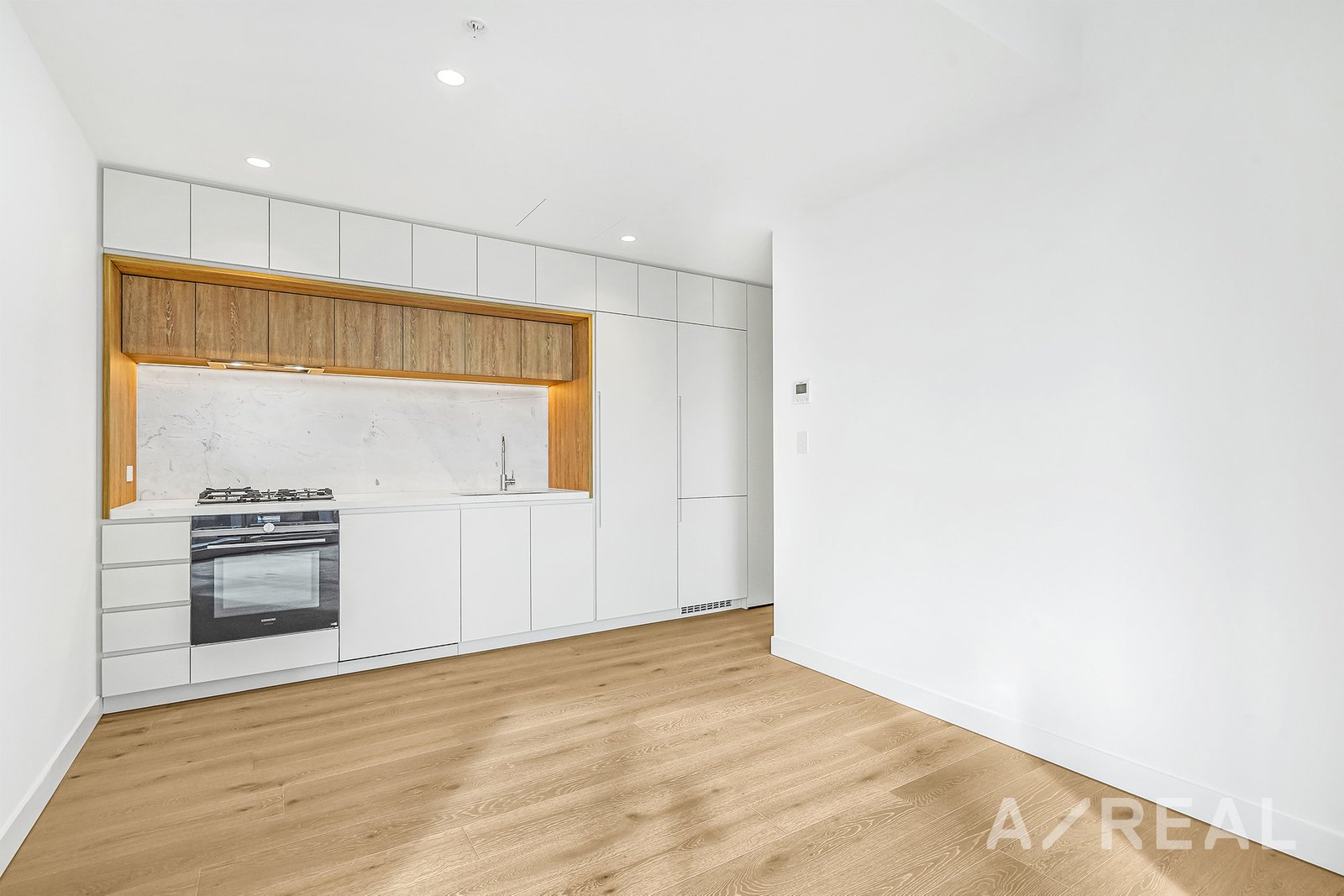 - Kitchen equipped with unique marble splash back, stainless steel appliances, gas cooktop, oven, integrated fridge and ample storage space