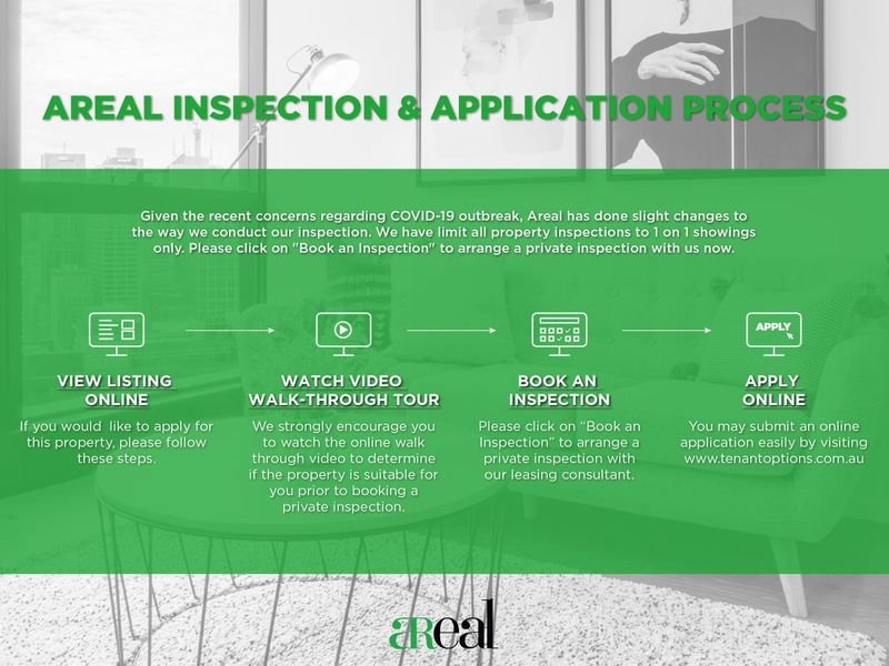 Arranging an inspection is easy. Click on "Book an Inspection Time" or "Email Agent" to book a time to inspect.By registering, you will be receiving any updates, changes or cancellations.