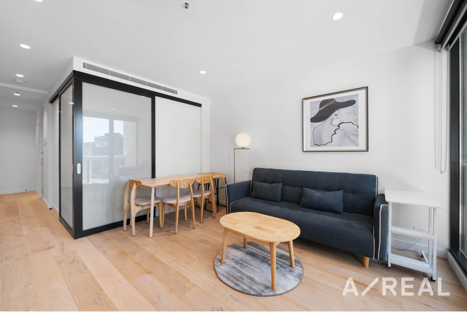 The open plan living/dining area showcases warm timber flooring and ample storage space. The apartment comes fully furnished with essential appliances including a refrigerator, washing machine, dryer, sofa, and bed. Notable features include European appliances, a natural stone kitchen bench top, and a splashback.