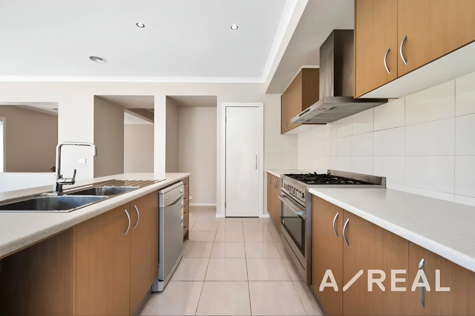 The heart of the home is the open-plan living area with soft carpet, leading to a second living/study area and a modern kitchen with a 5-burner gas stove, oven, walk-in pantry, and adjoining dining area. Additional comforts include ducted heating and cooling systems, a house alarm, laundry, powder room, and a double remote garage.