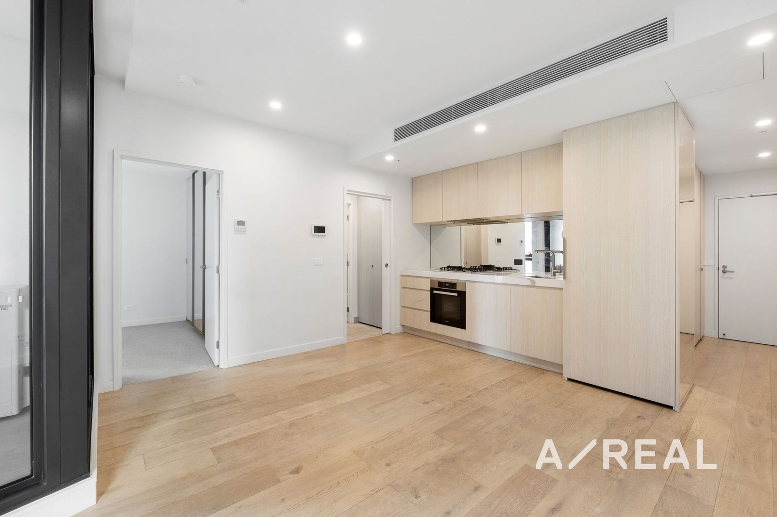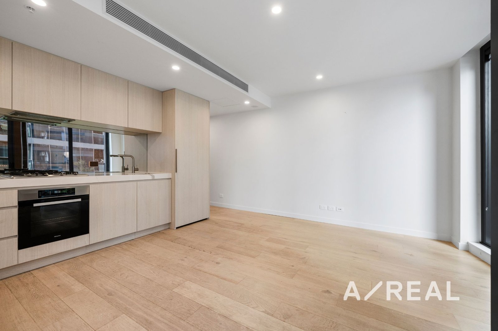 Light-filled Interiors: Floor-to-ceiling windows enhance the open-plan living and dining area, finished with warm timber floors and extending to a private balcony with sweeping city skyline views.