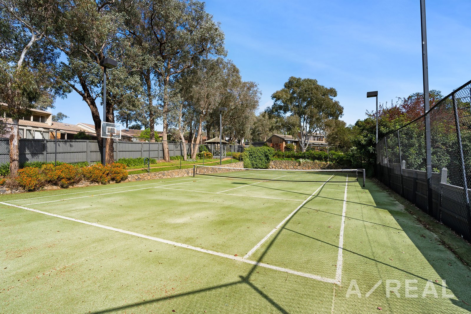 The estate's exterior is a harmonious blend of manicured lawns, flourishing gardens, and a floodlit tennis court. The cottage, with its two bedrooms and one bathroom, stands separate, ensuring total privacy. It even boasts its own exclusive entrance via Lenkunya Court.