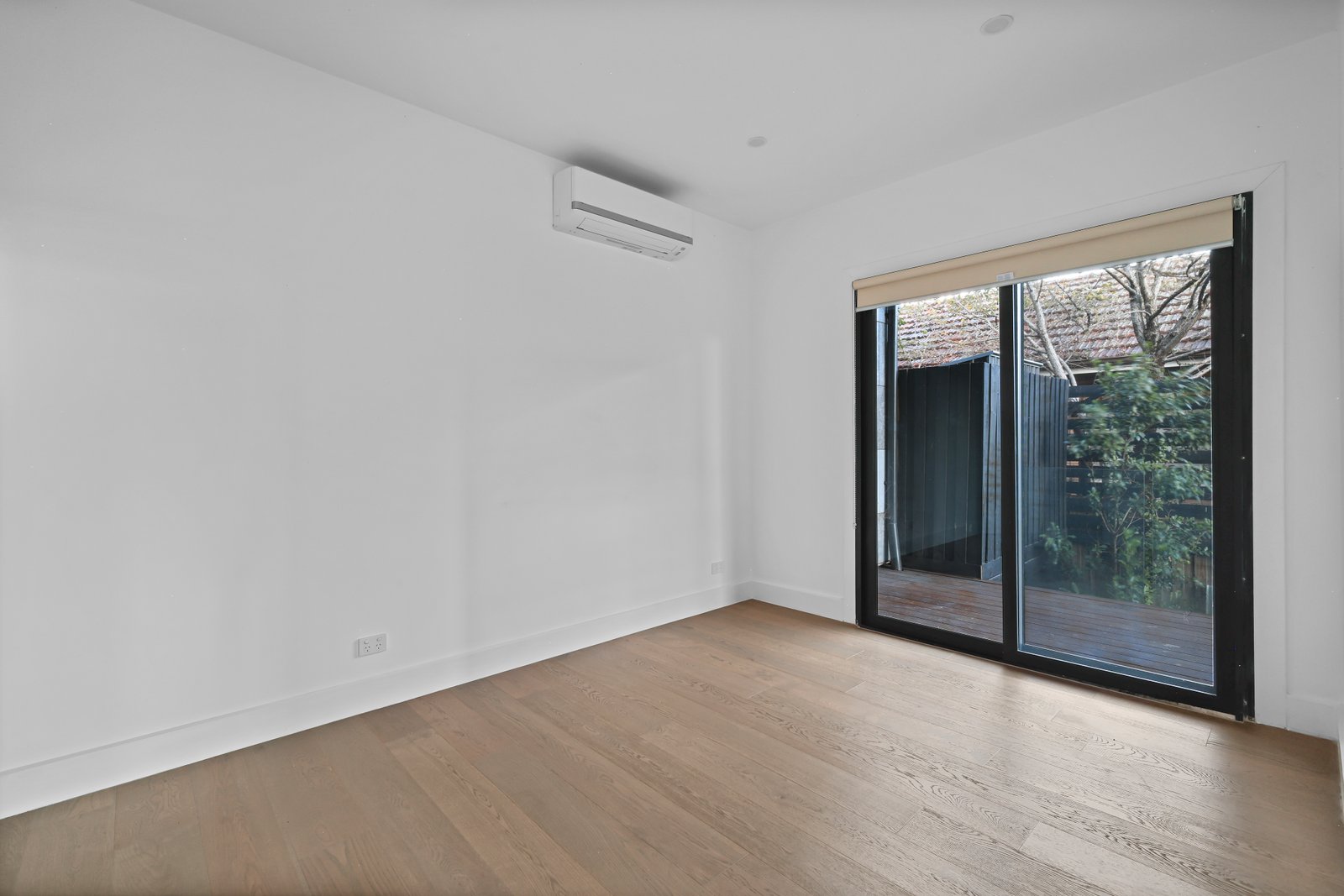 Glass sliding doors open to a beautifully landscaped courtyard, offering a private and stylish space for outdoor enjoyment.
