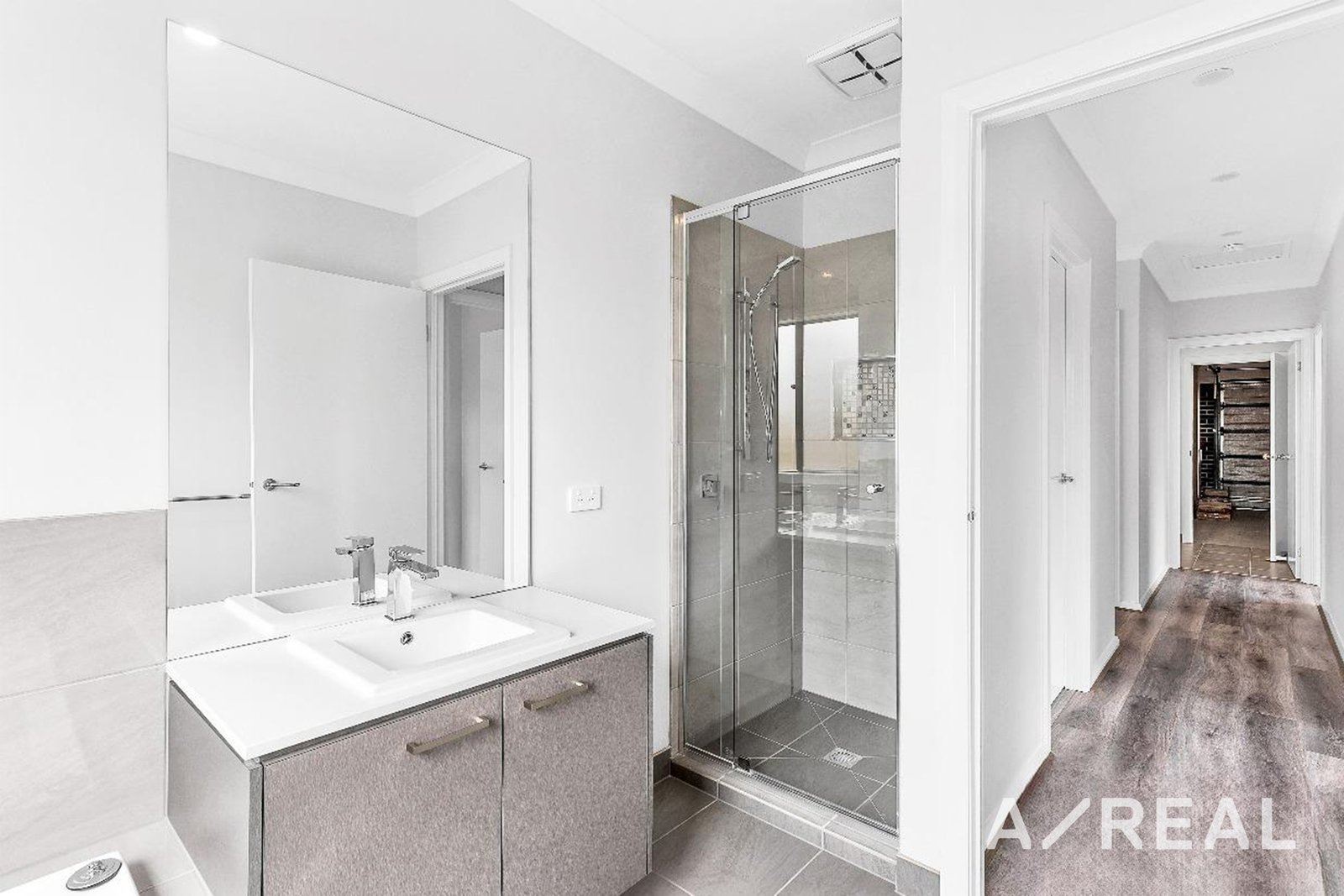 The home features two well-appointed bathrooms with semi-frameless shower screens, modern tiling, a large bathtub, frosted windows for privacy, and sleek fixtures. Additional highlights include Fiber/NBN connectivity, an open-plan layout, a low-maintenance backyard with sliding door access, a separate laundry, ducted heating, flyscreens, and a double garage.