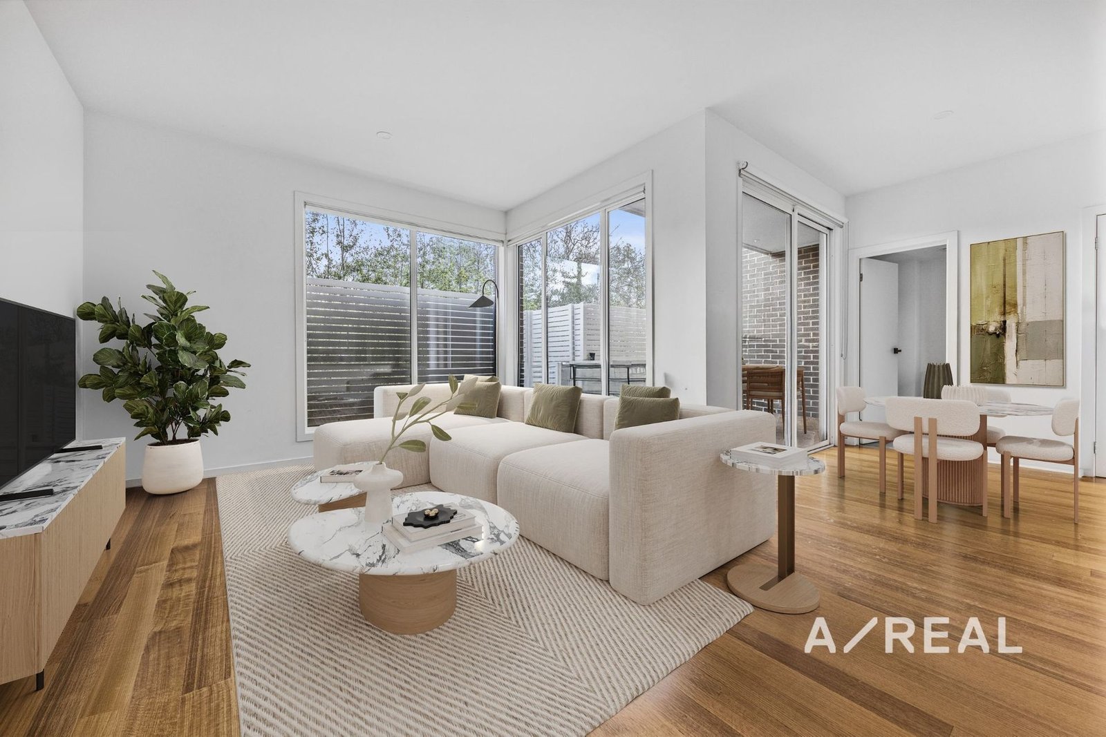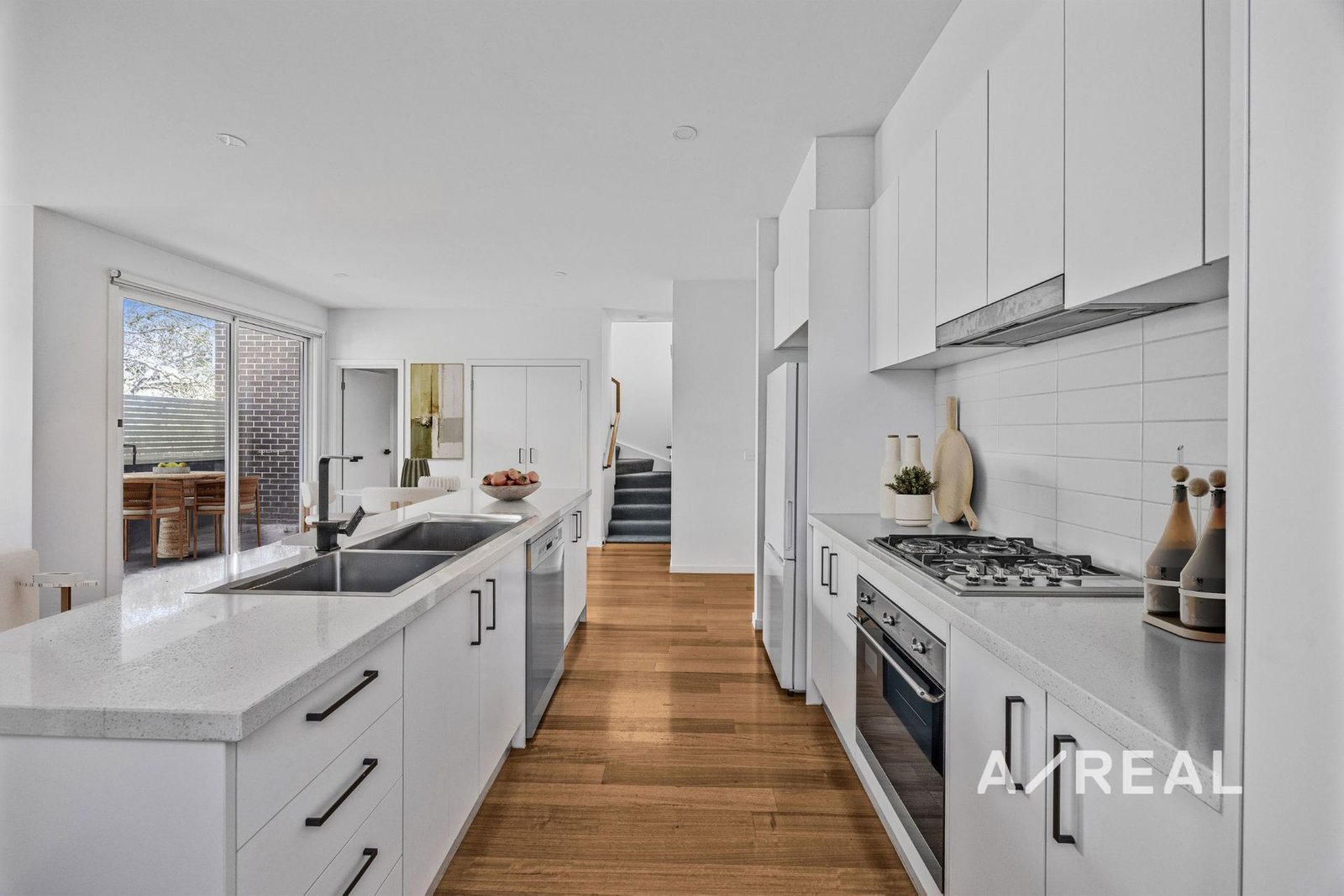 Finished with timber floors and modern tones, the open-plan layout is served by a sleek, well-equipped kitchen boasting stone surfaces and ample storage, before flowing outdoors to an entertaining alfresco.
