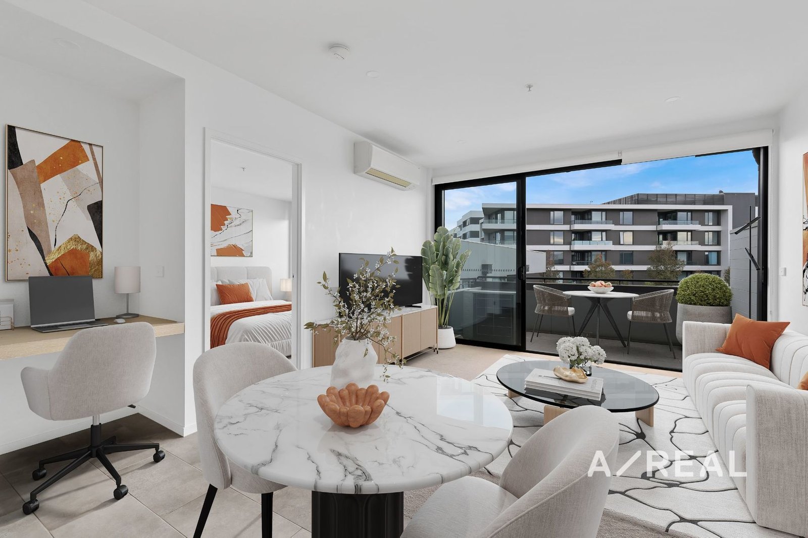 The open-plan living and dining zone flows seamlessly to a sleek kitchen appointed with stone benchtops and quality appliances, before extending out to a private balcony ideal for entertaining.
