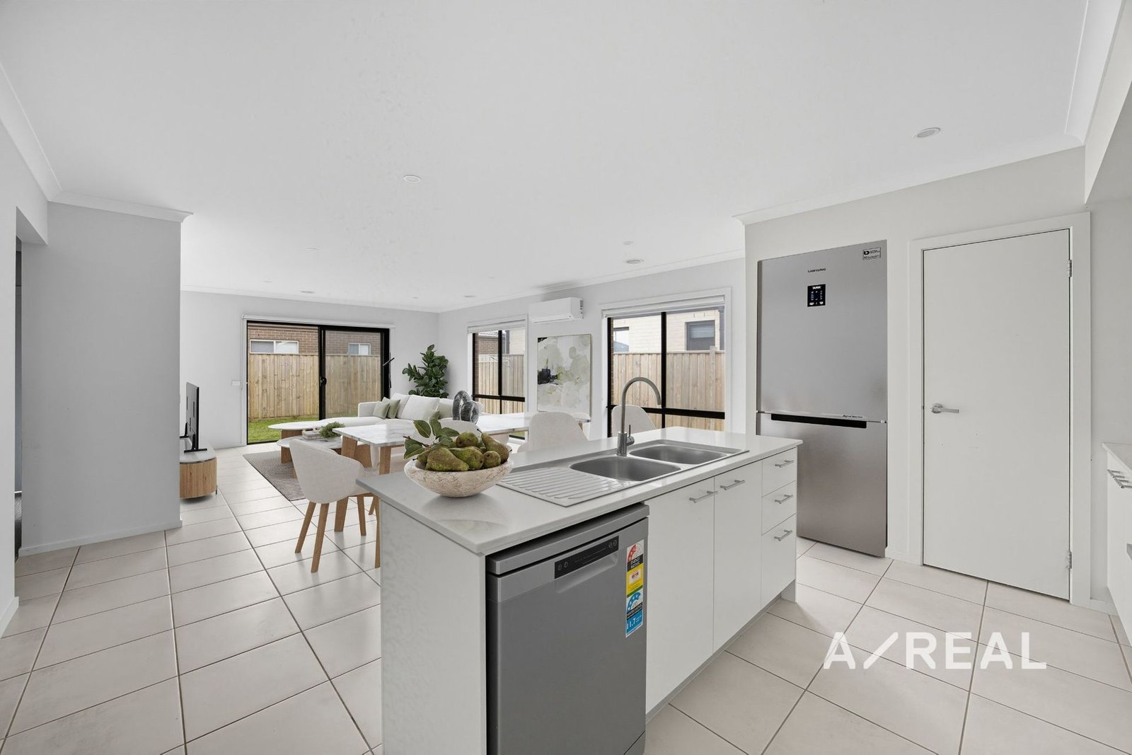 At the heart of the home, the north-facing open-plan living and dining area seamlessly connects to a sleek kitchen, superbly appointed with stainless steel appliances, stone surfaces and breakfast bar - an ideal setting for both everyday meals and relaxed entertaining.
