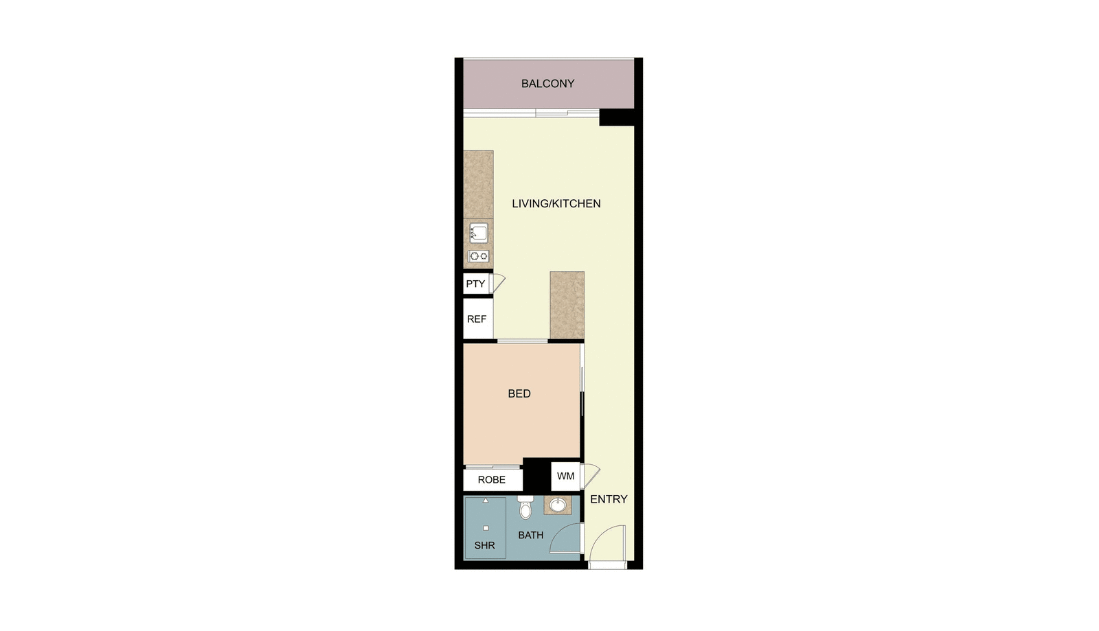 Step inside to a bright open-plan living area that flows seamlessly to your private balcony, offering beautiful views to the east. The contemporary kitchen comes complete with a stone benchtop, stone splashback, breakfast bar, dishwasher, and abundant storage — perfect for easy everyday living. The bedroom includes built-in robes, and the stylish bathroom is designed with a mirrored vanity and generous storage space.