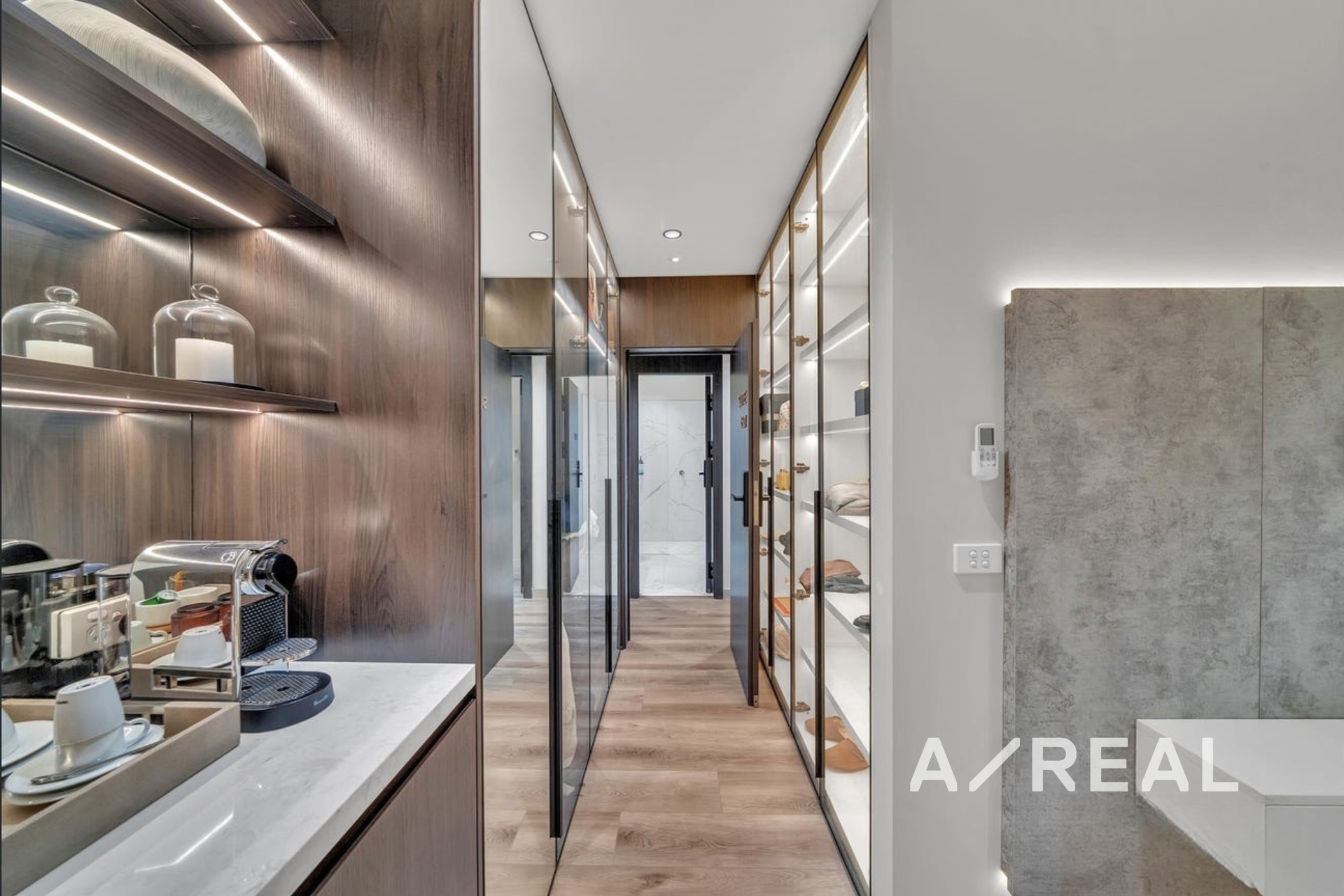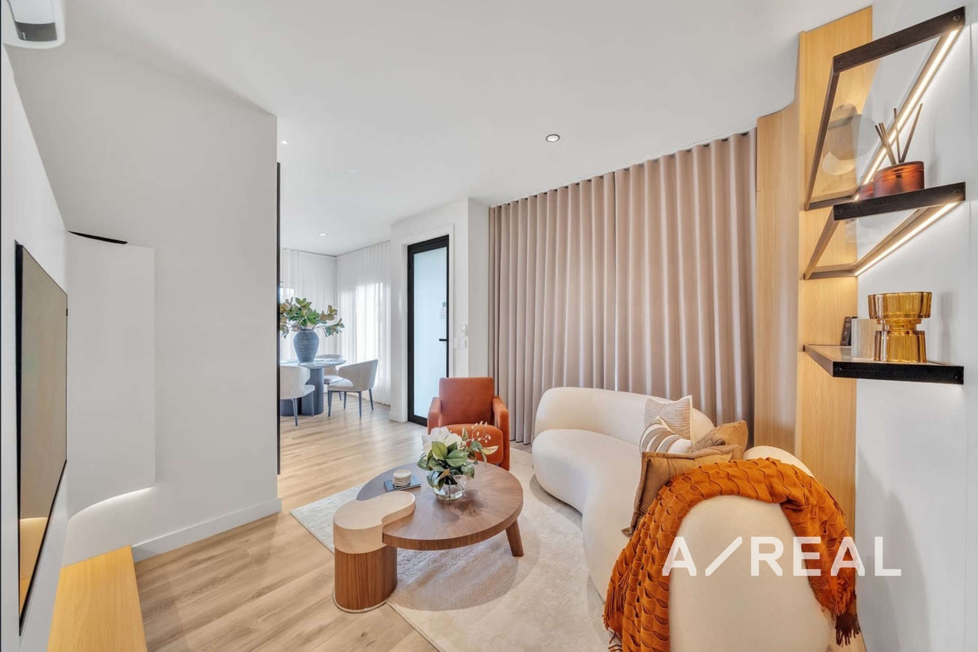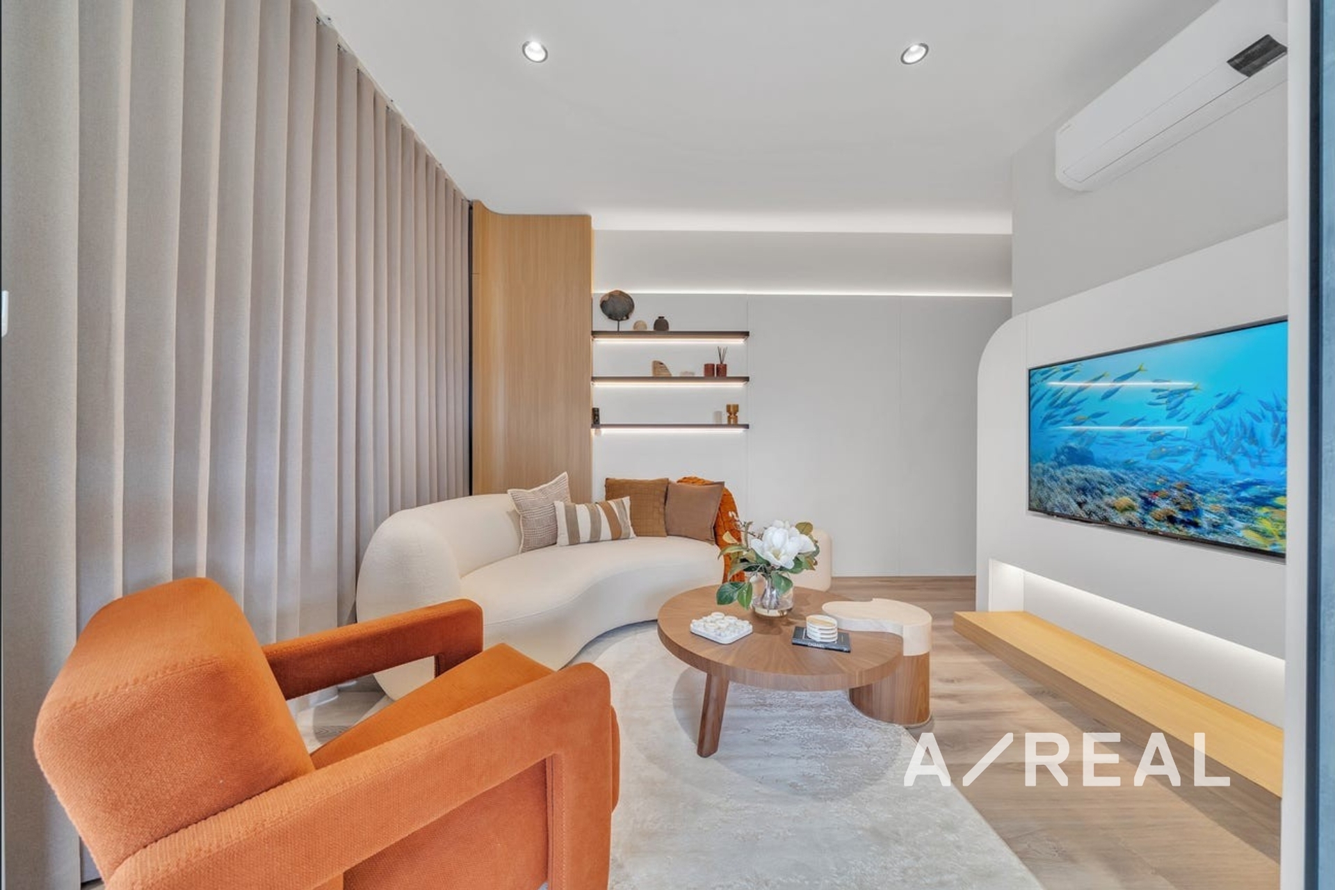 Spacious open-plan living area, enhanced by custom cabinetry, featuring LED glass shelving, and a striking oversized art display to elevate the space.