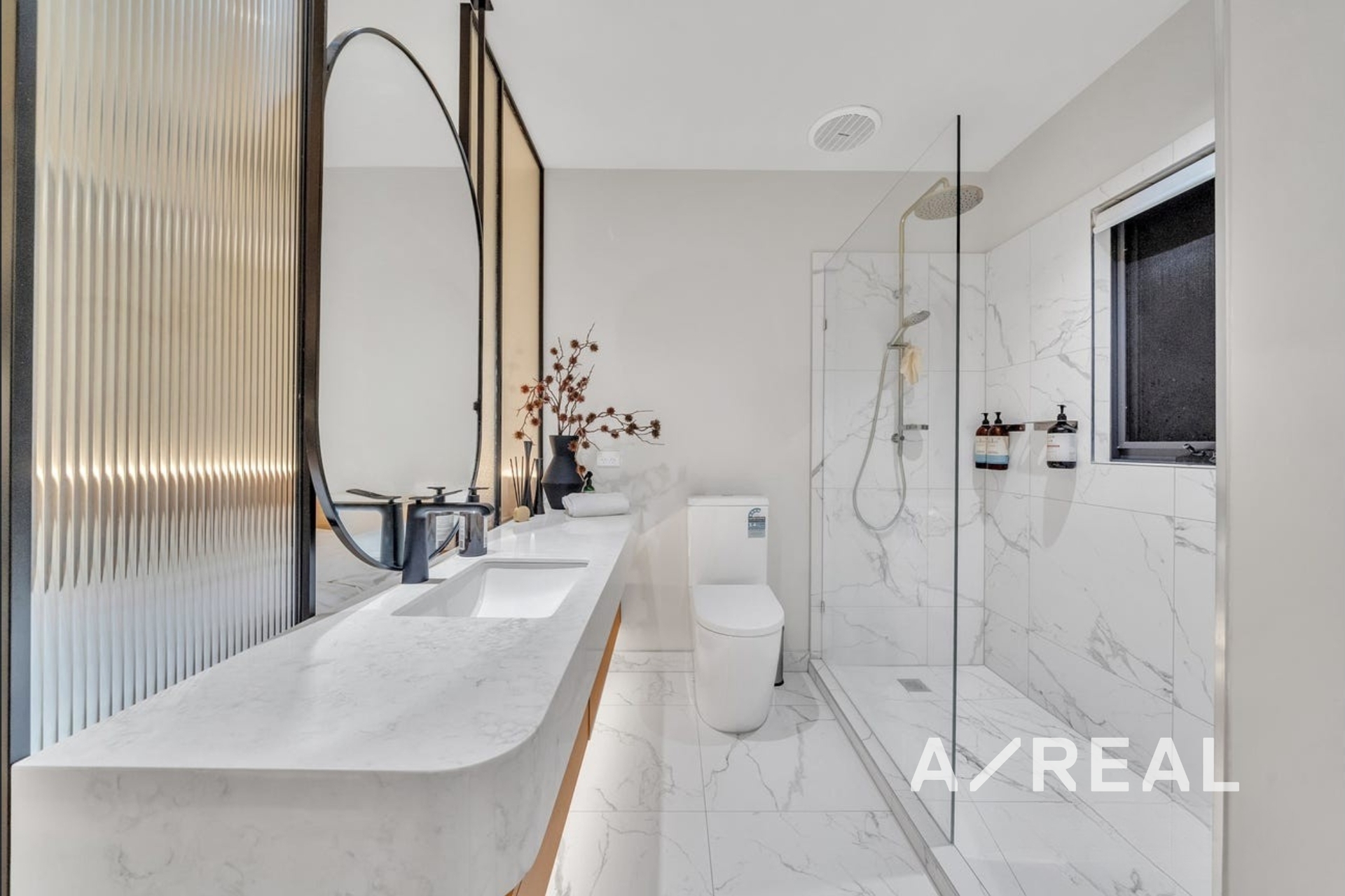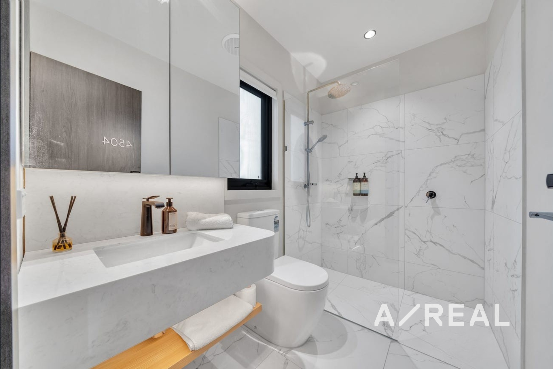 Two sophisticated bathrooms with stone benchtops, oversized double showers, and LED-lit vanities for a sleek, contemporary finish.