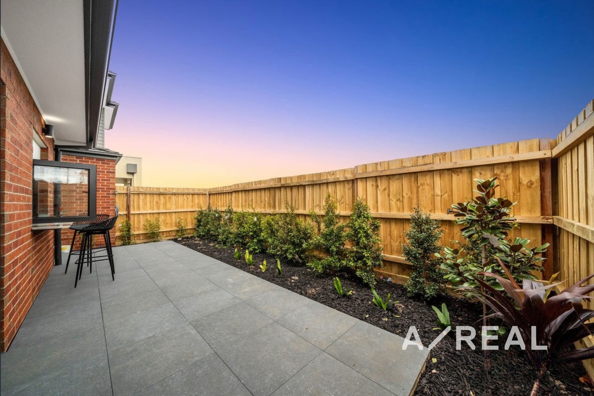 Outdoor entertaining zone with established gardens, feature lighting, and an automated irrigation system – ideal for relaxed gatherings.