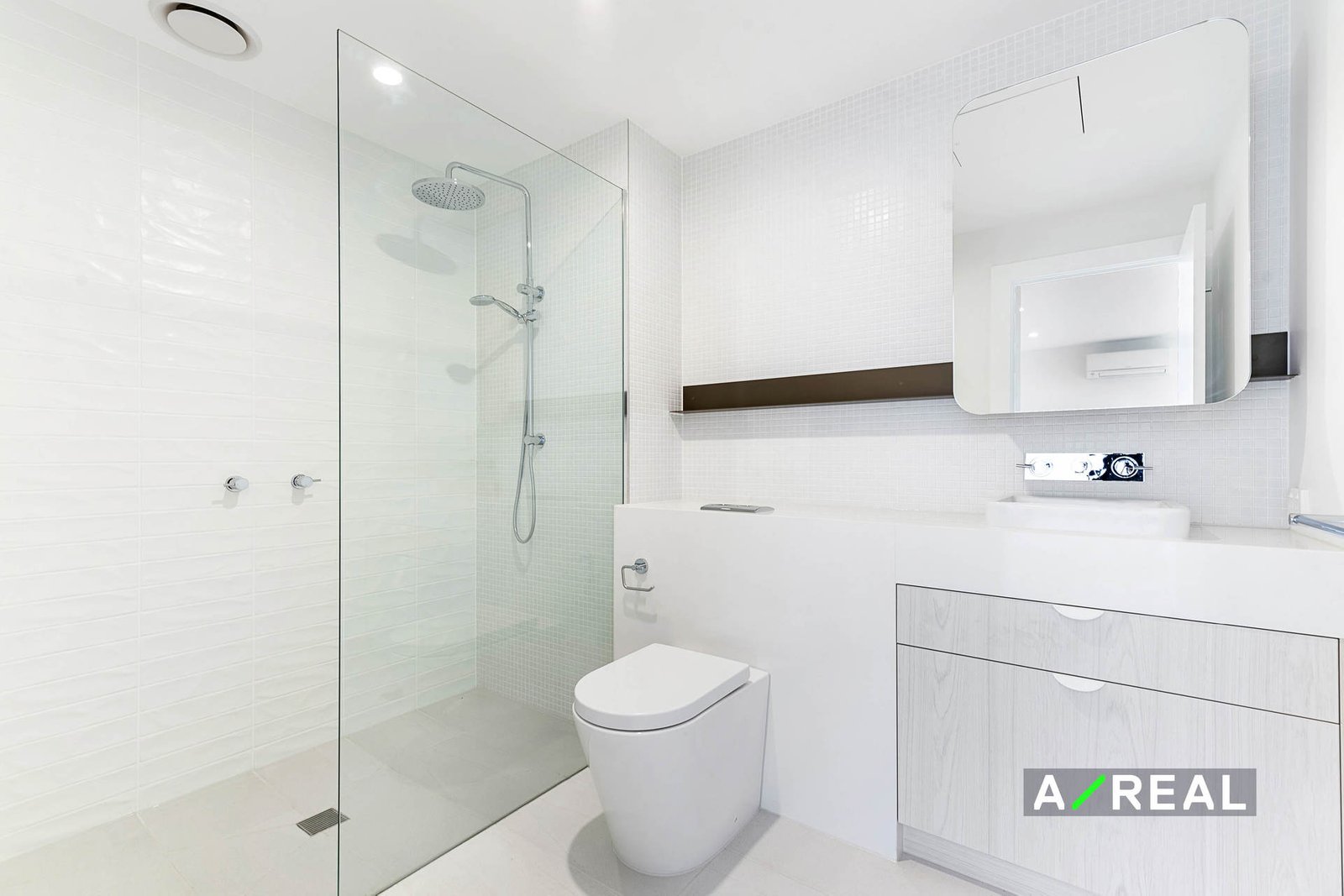 The elegant bathroom is designed with skillful detailing, from the contrasting feature tiling to the shapely curves of the mirrors and basins at the marble vanity. Featuring rain head showers, stainless steel fixtures, ample shelving, and storage space, the bathroom in this stunning apartment offers chic, luxurious efficiency.