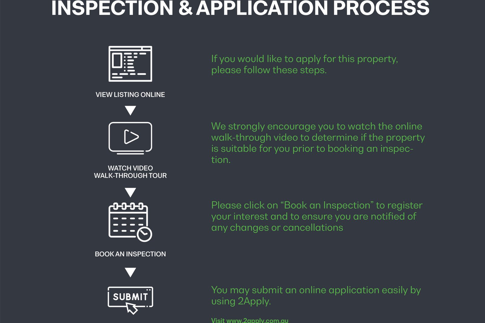 To APPLY, you must INSPECT the property FIRST, please note we will not accept an application until this has occurred. Its easy, simply click on EMAIL AGENT, enter your details and receive instant details of the next inspection time.