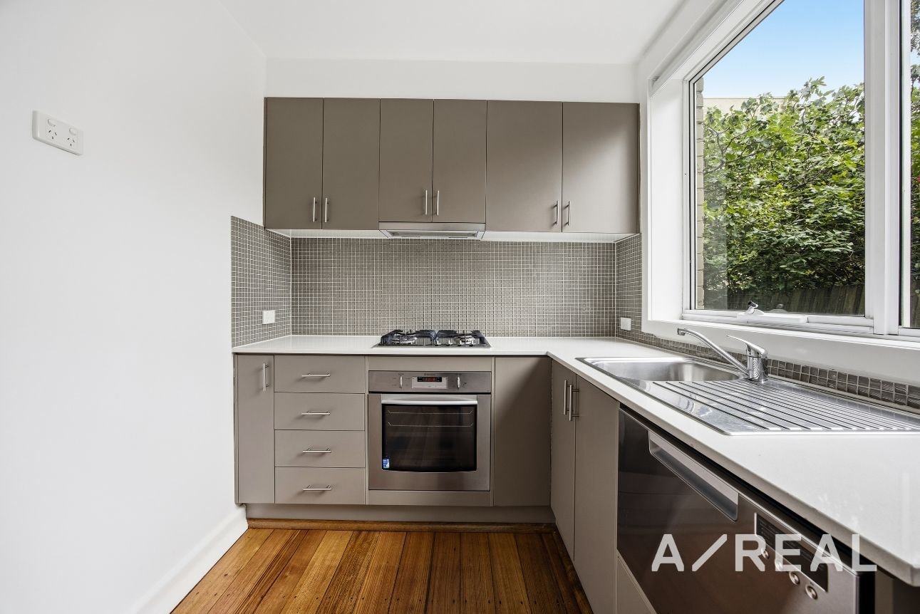 Behind its timeless façade, the interior reveals a light-filled layout enhanced by modern finishes, creating an inviting atmosphere ideal for first-home buyers, downsizers or savvy investors. Timber floors add character to the open-plan living/dining area, complemented by a stylish, well-equipped kitchen featuring stainless steel appliances, 2 robed bedrooms, immaculate bathroom and split system heating/AC. Private Courtyard on title access via Carpark